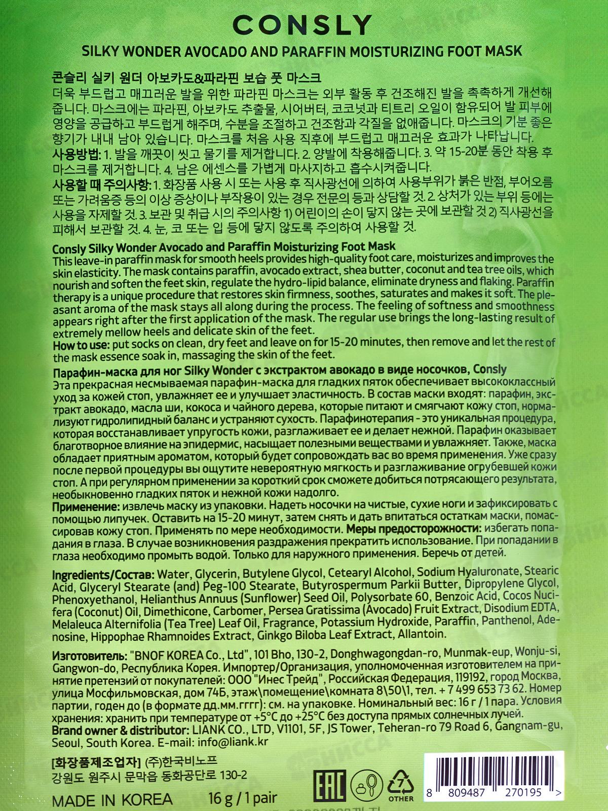 Consly Маска парафин для ног S.W. с экстр авокадо в виде носочков 16г