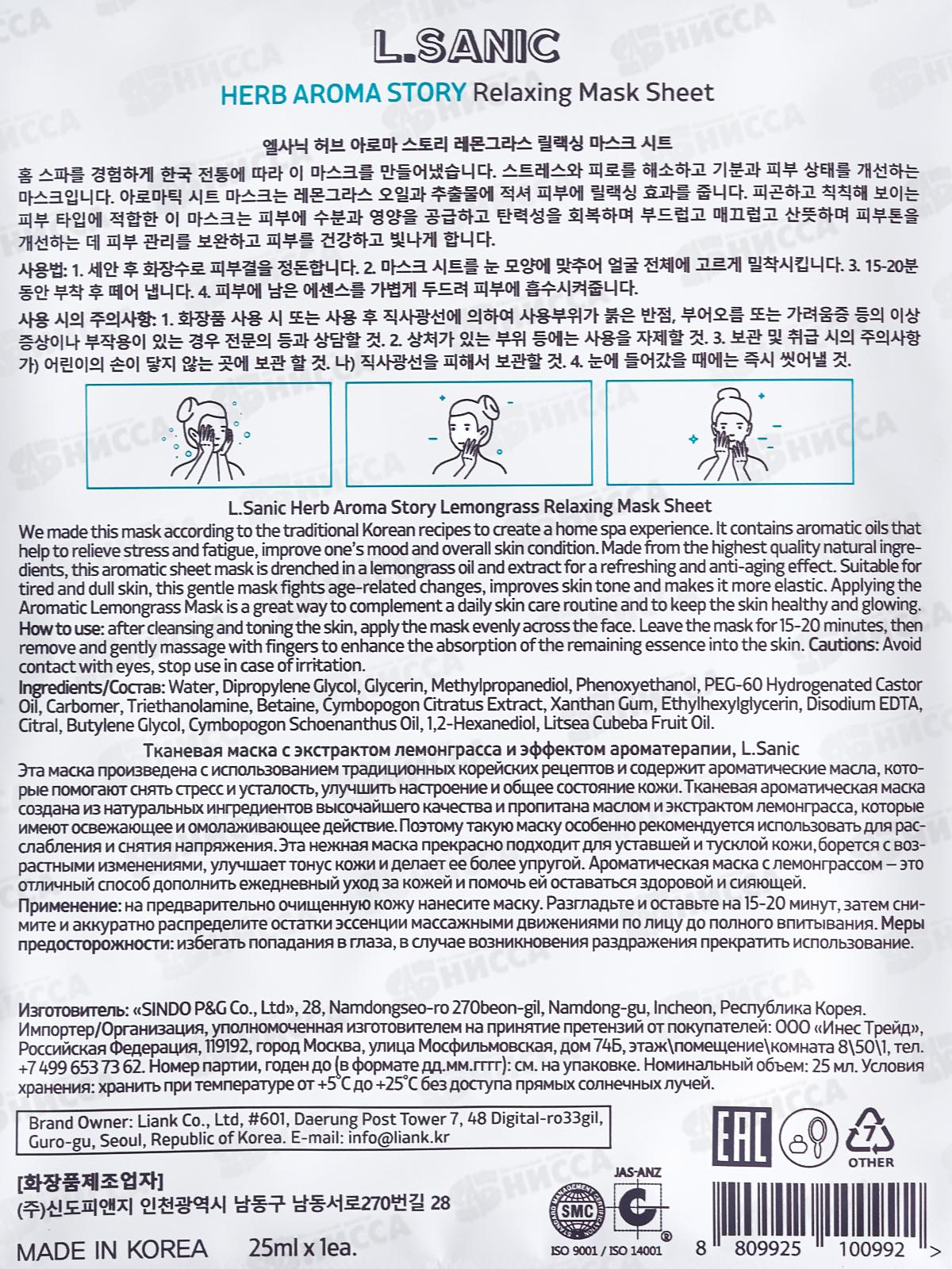 L.Sanic Маска тканевая H.A.A. с экстр лемонграс и эффект ароматер 25мл