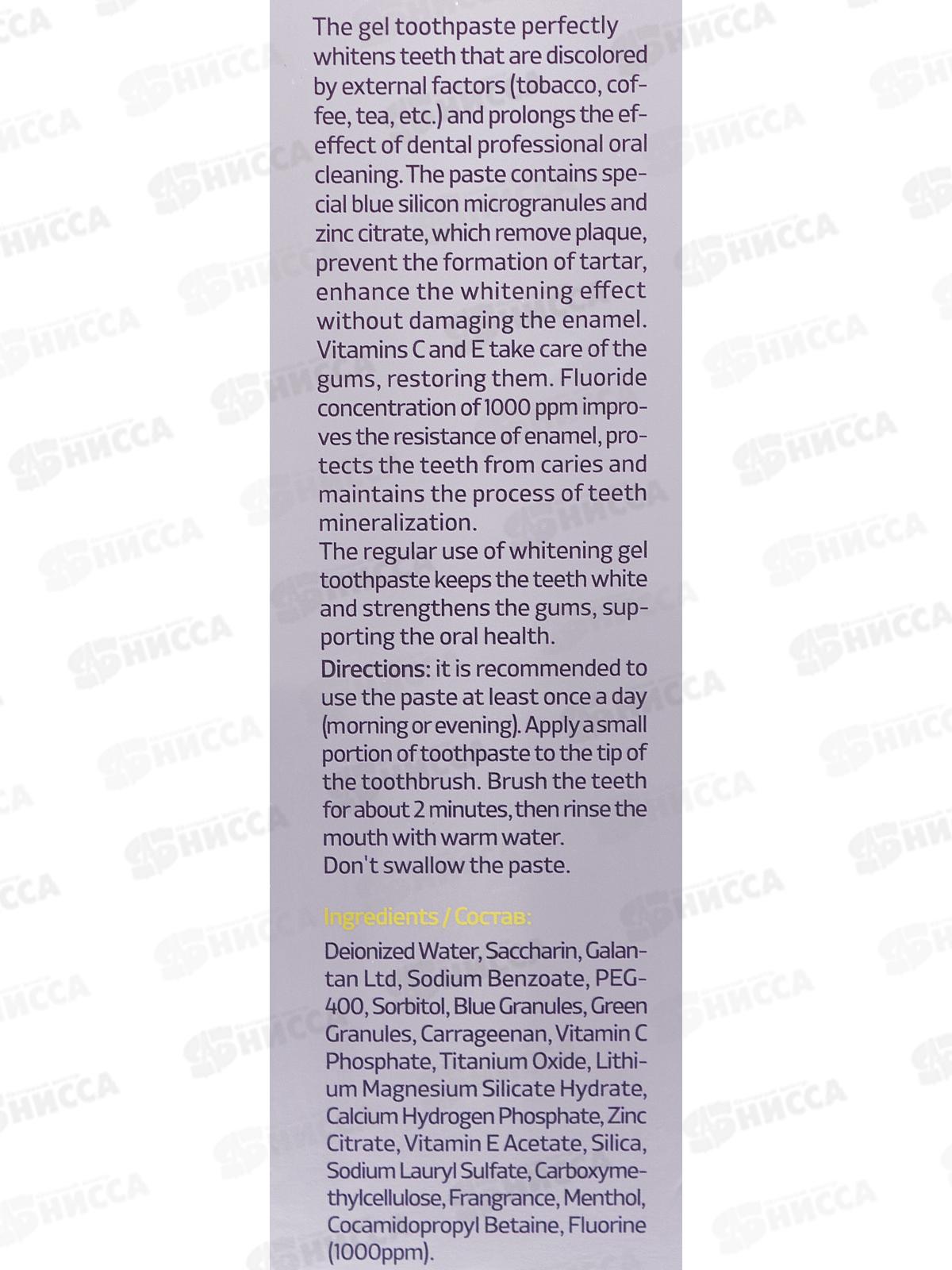 Состав: деионизированная вода, Сахарин, Galantan Ltd, бензоат натрия, фосфат витамина С, ПЭГ-400, сорбитол, синие гранулы, каррагинан, цитрат цинка, ацетат витамина Е, диоксид кремния, лаурилсульфат натрия, карбоксиметилцеллюлоза, отдушка, ментол, кокамидопропилбетаин, фтор.