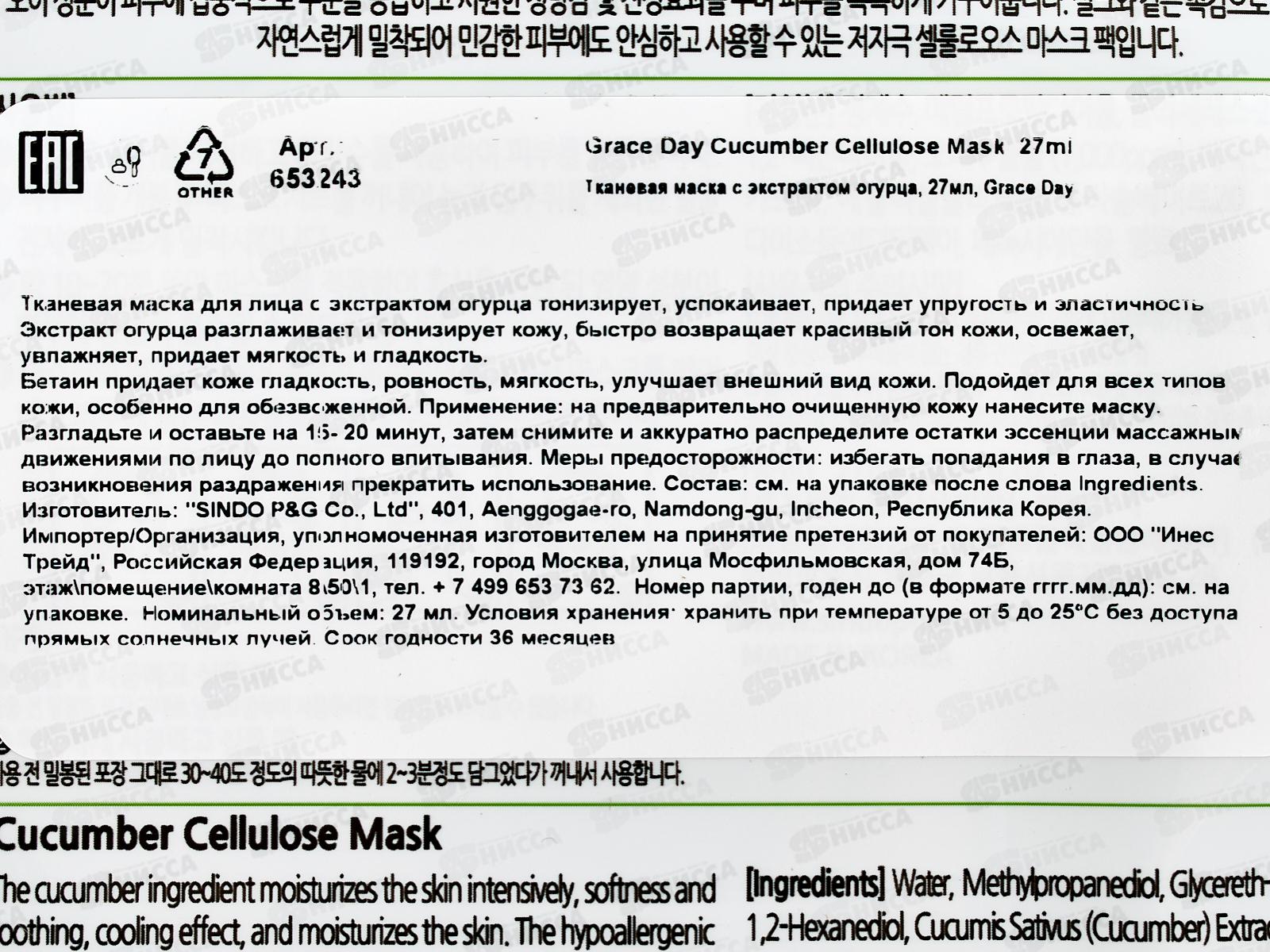 Grace Day Маска тканевая с экстрактом огурца 27мл 653243