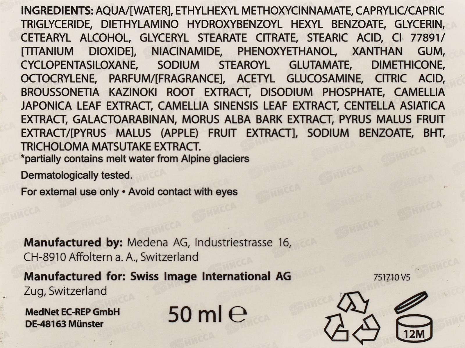 Состав: вода, этилгексилметоксициннамат, каприловый/каприновый триглицерид, диэтиламиногидроксибензоилгексилбензоат, глицерин, цетеариловый спирт, глицерилстеаратцитрат, стеариновая кислота, CI 77891/[диоксид титана], ниацинамид, феноксиэтанол, ксантановая камедь, циклопентасилоксан, стеароилглутамат натрия, диметикон, октокрилен, парфюмерная композиция/[ароматизатор], ацетилглюкозамин, лимонная кислота, экстракт корня бруссонетии казиноки, динатрийфосфат, листья камелии японской ЭКСТРАКТ, ЭКСТРАКТ ЛИСТЬЕВ CAMELLIA SINENSIS, ЭКСТРАКТ ЦЕНТЕЛЛЫ АЗИАТСКОЙ, ГАЛАКТОАРАБИНАН, ЭКСТРАКТ КОРЫ MORUS ALBA, ЭКСТРАКТ ПЛОДОВ PYRUS MALUS/[ЭКСТРАКТ ПЛОДОВ ЯБЛОКА (PYRUS MALUS)], БЕНЗОАТ НАТРИЯ, BHT, ЭКСТРАКТ ТРИХОЛОМЫ МАЦУТАКЭ.