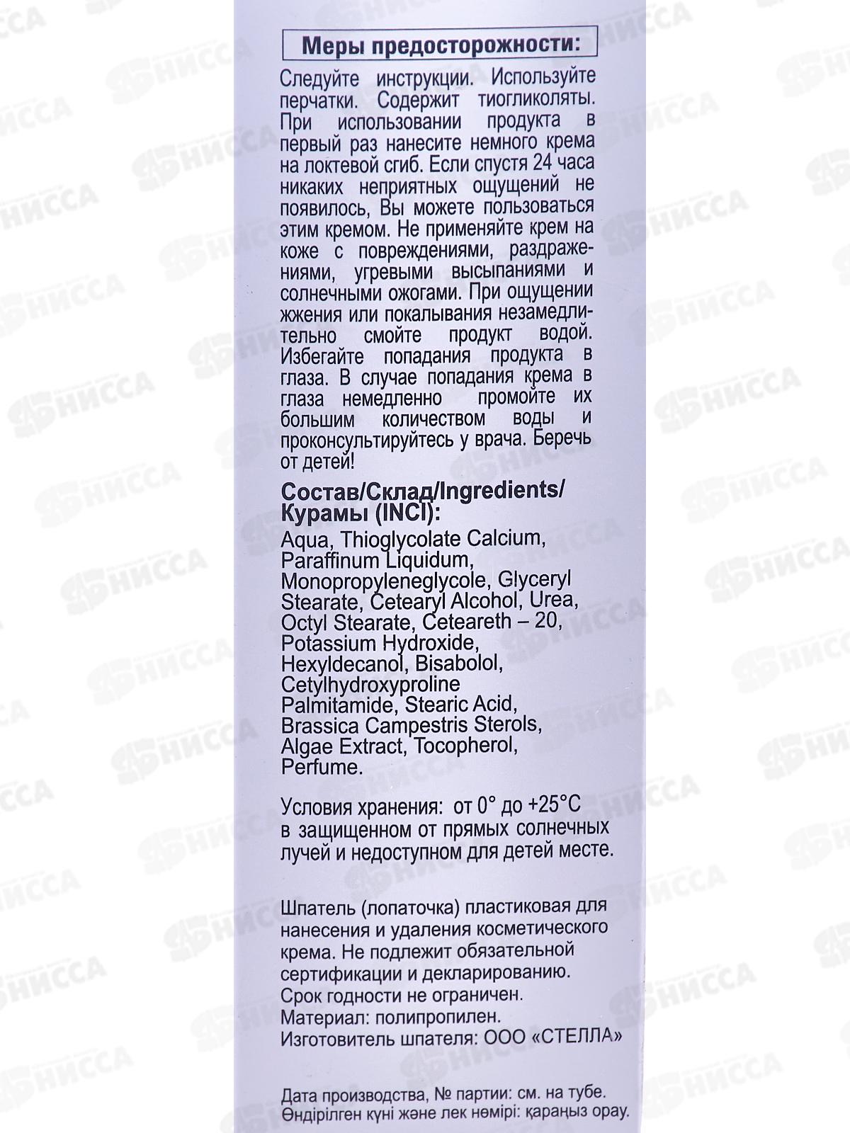 Состав: вода, тиогликолят кальция, жидкий парафин, монопропиленгликоль, глицерилстеарат, цетеариловый спирт, мочевина, октилстеарат, цетеарет-20, гидроксид калия, гексилдеканол, бисаболол, пальмитамид цетилгидроксипролина, стеариновая кислота, стерины Brassica Campestris, экстракт водорослей, токоферол, отдушка.