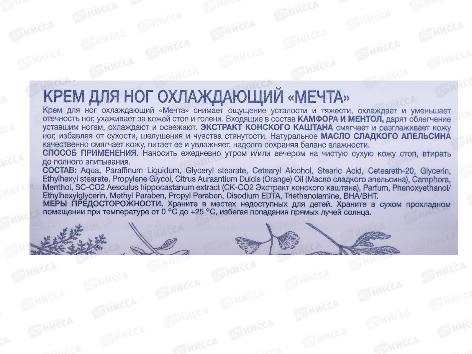 Охлаждающий крем для ног Мечта быстро снимет ощущение усталости и тяжести. Ментол охлаждает и снимает отечность ног, хорошо ухаживает за кожей стоп и голеней, дарит чувство легкости. Натуральные масла качественно смягчают кожу, питают ее и увлажняют, надолго сохраняя баланс влажности. Легкий охлаждающий крем дарит мгновенное облегчение уставшим ногам. Эфирное масло апельсина освежает, оказывает успокаивающее действие, помогает снять напряжение. Экстракт конского каштана смягчает и разглаживает кожу ног, избавляя от сухости, шелушения и стянутости. Камфорное масло оказывает болеутоляющее и противовоспалительное действие. Способ применения: Наносить ежедневно утром и/или вечером на чистую сухую кожу стоп, втирать до полного впитывания.