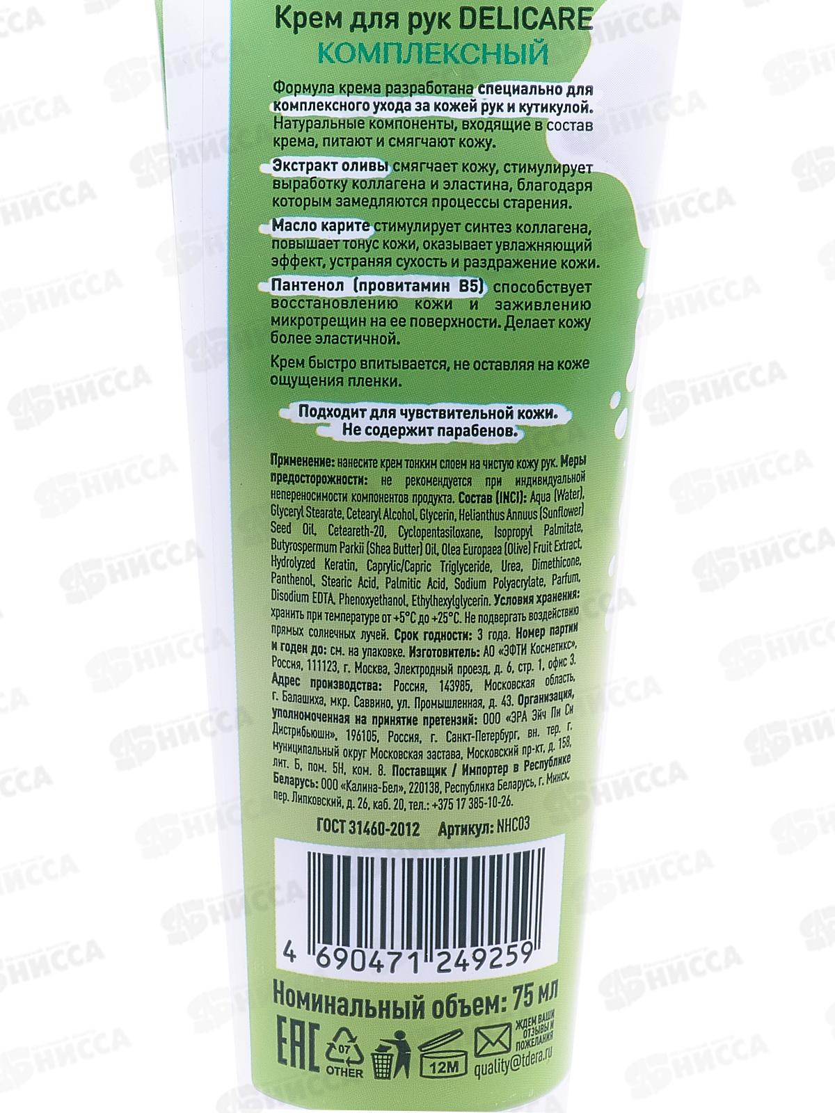 Состав: вода, глицерилстеарат, цетеариловый спирт, Глицерин, Экстракт семян гелиантуса однолетнего, Цетеарет-20, Циклопентасилоксан, изопропилпальмитат, Масло Butyrospermum Parkii (Масло ши), Экстракт плодов Оливы Европейской (Olea Europaea), гидролизованный кератин, Каприловый триглицерид, мочевина., Диметикон, Пантенол, Стеариновая кислота, Пальмитиновая кислота, полиакрилат натрия, Парфюмированная вода, Динатрий ЭДТА. Феноксиэтанол, этилгексилглицерин.