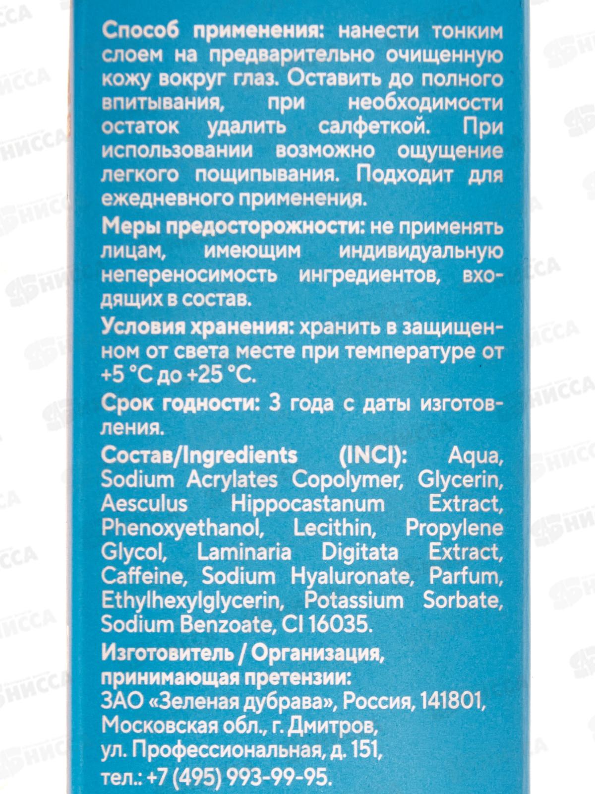 Состав: вода, Сополимер акрилатов натрия, глицерин, экстракт конского каштана обыкновенного, феноксиэтанол, лецитин, пропиленгликоль, экстракт ламинарии пальчатой, кофеин, гиалуронат натрия, отдушка, этилгексилглицерин, сорбат калия, бензоат натрия, CI 16035.