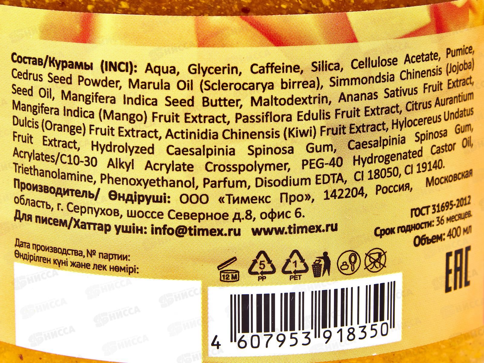 Состав: вода, Глицерин, Кофеин, Кремний, Ацетат целлюлозы, Пемза, Порошок семян кедра, Масло марулы (Sclerocarya birrea), Масло семян жожоба (Simmondsia Chinensis), Масло семян мангиферы индийской (Mangifera Indica), Мальтодекстрин, Экстракт плодов ананаса посевного, Экстракт плодов манго (Mangifera Indica), Экстракт плодов пассифлоры съедобной (Passiflora Edulis), Экстракт плодов апельсина (Citrus Aurantium Dulcis), Экстракт плодов киви (Actinidia Chinensis), Экстракт плодов гилоцереуса волнистого (Hylocereus Undatus), Гидролизованная камедь цезальпинии колючей, Камедь цезальпинии колючей, Сшитый сополимер акрилатов/C10-30 алкилакрилата, ПЭГ-40 гидрогенизированное касторовое масло, Триэтаноламин, Феноксиэтанол, Парфюм, Динатриевая ЭДТА, CI 18050, CI 19140.