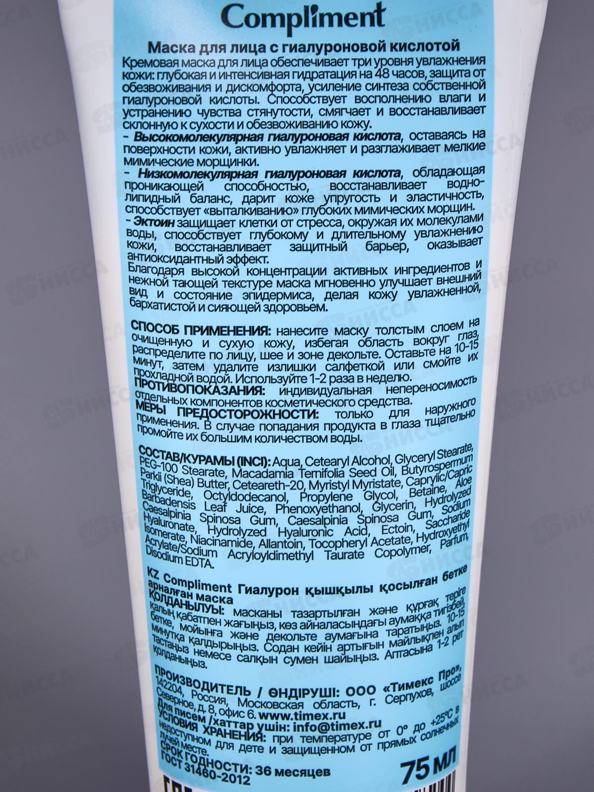 Compliment маска для лица с гиалуроновой кислотой 75мл *12