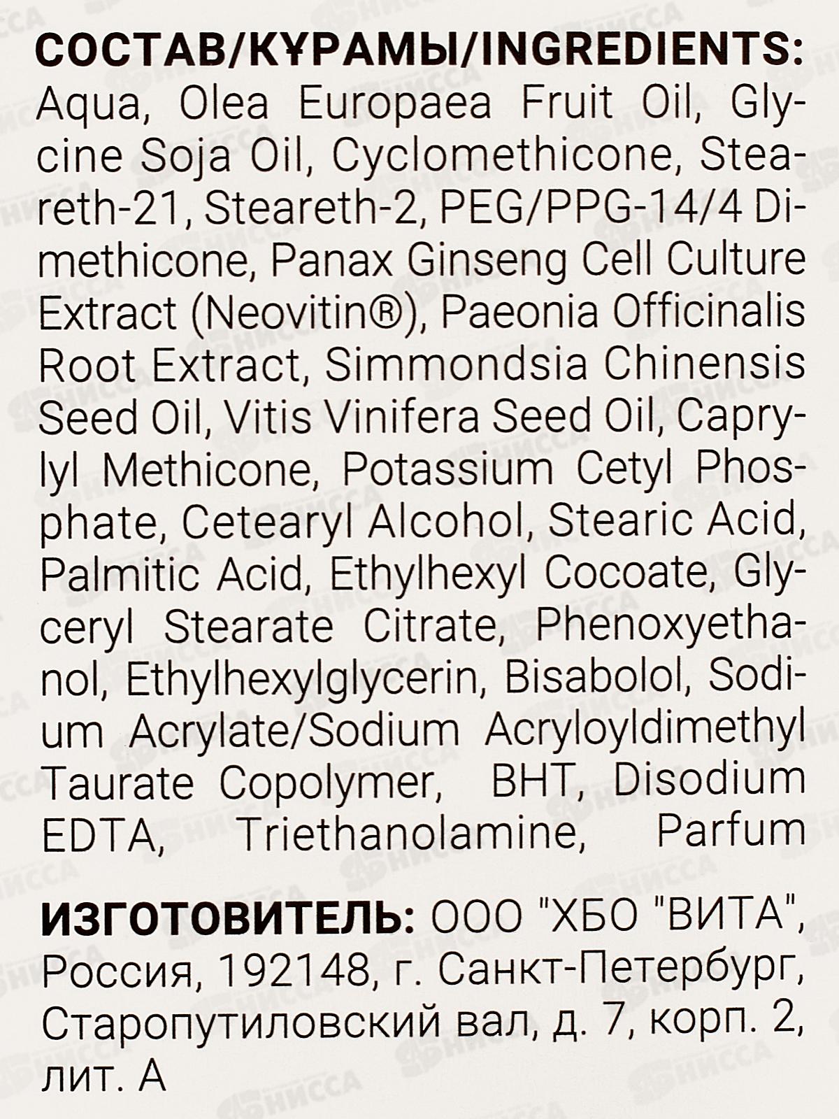 Состав: вода, Масло плодов Олеи Европейской, гликолевое масло Сои, Циклометикон, Стеарет-21, Стеарет-2, ди-метикон PEG/PPG-14/4, Экстракт культуры клеток женьшеня Панакс (Неовитин®), экстракт корня пеонии лекарственной, Масло семян симмондсии Китайской, Масло семян Витиса Виниферы, Капри- лил метикон, цетилфосфат калия, цетеариловый спирт, стеариновая кислота, Пальмитиновая кислота, Этилгексилкоат, цитрат глицерилстеарата, Феноксиэтанол, этилгексилглицерин, Бисаболол, Сополимер акрилата натрия с акрилоилдиметилтауратом натрия, BHT, Динатрий ЭДТА, триэтаноламин, Парфюмерия.
