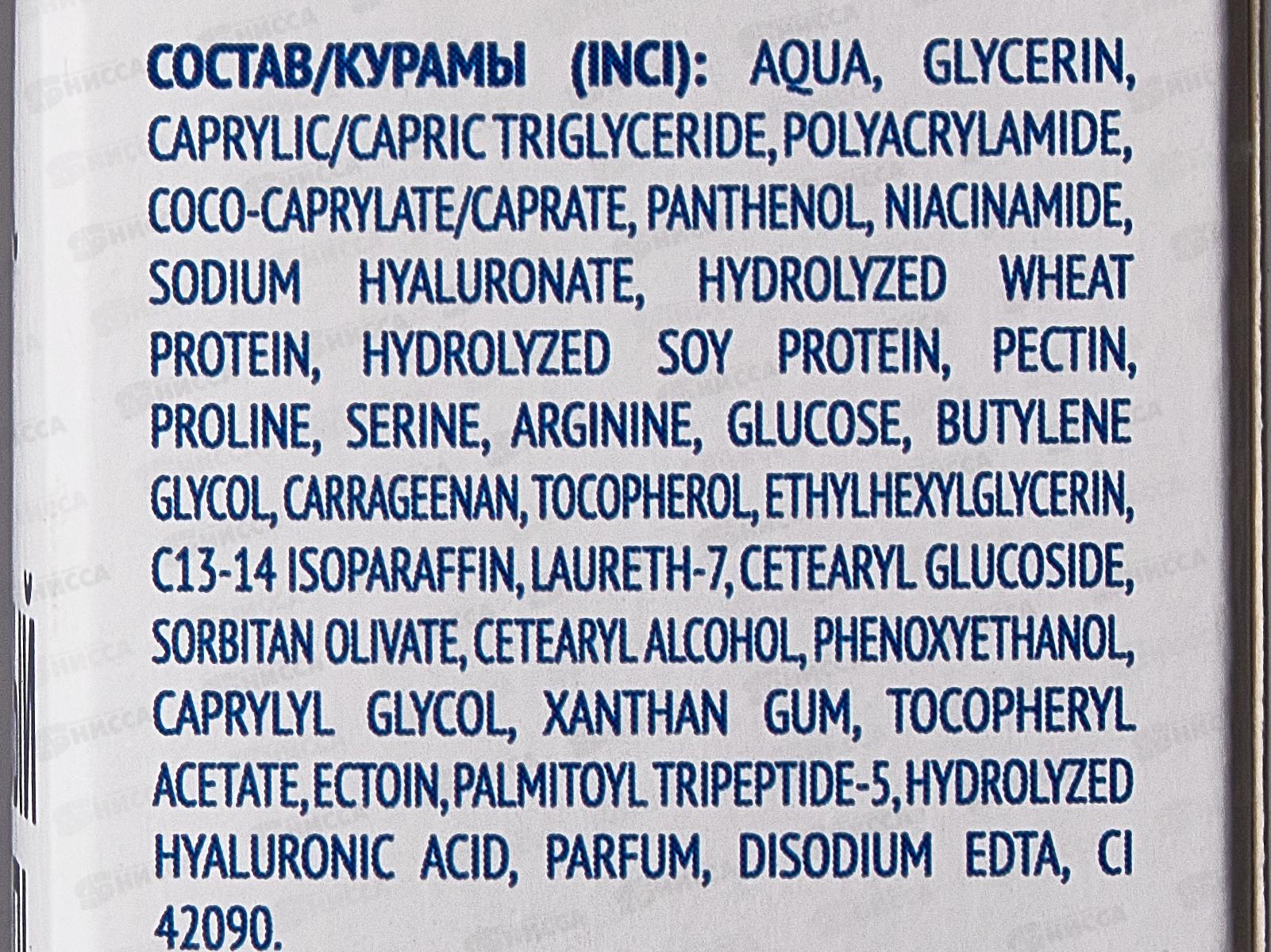 Состав: вода, глицерин, каприл/каприктриглицерид, полиакриламид, коко-каприлат/капрат, пантенол, ниацинамид, гиалуронат натрия, гидролизованный пшеничный протеин, гидролизованный соевый протеин, пектин, пролин, серин, аргинин, глюкоза, бутиленгликоль, каррагинан, токоферол этилгексилглицерин, изопарафин с13-14, лаурет-7, цетеариловый глюкозид, сорбитан оливата, цетеариловый спирт, феноксиэтанол, каприлилгликоль, ксантановая камедь, токоферилацетат, эктоин, пальмитоил трипептид-5, гидролизованный гиалуроновая кислота, парфюмерная композиция, динатрий эдта, ci 42090.