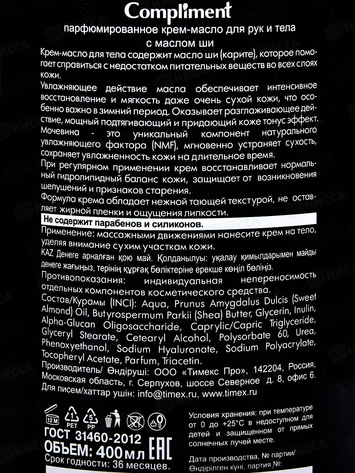 КОМПЛИМЕНТ Парфюмированное крем-масло для рук и тела с маслом ши 400мл