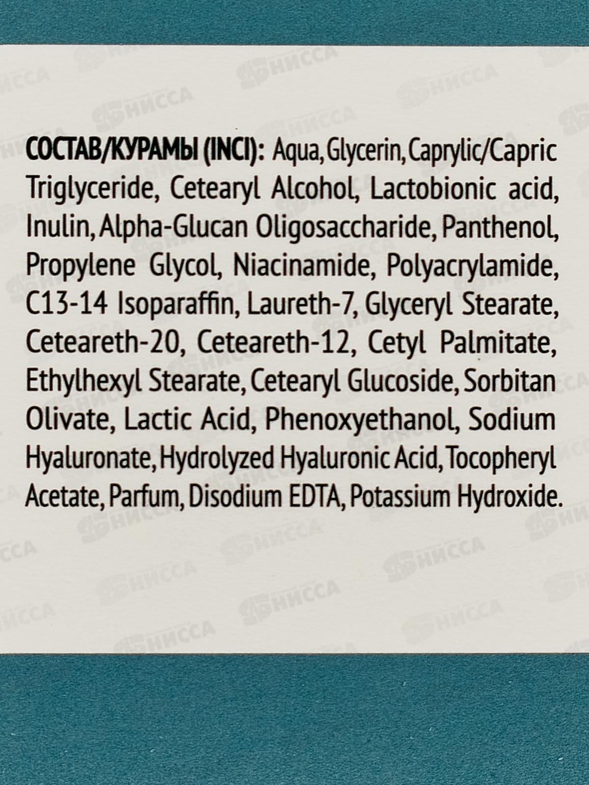 Состав: вода, Глицерин, каприловый/каприновый триглицерид, цетеариловый спирт, лактобионовая кислота, инулин, альфа-глюкан олигосахарид, пантенол, пропиленгликоль, ниацинамид, полиакриламид, C13-14 изопарафин, лаурет-7, глицерилстеарат, цетеарет-20, цетеарет-12, цетилпальмитат, этилгексилстеарат, цетеарилглюкозид, сорбитан оливат, молочная кислота, феноксиэтанол, гиалуронат натрия, гидролизованная гиалуроновая кислота, токоферилацетат, парфюмерная композиция, динатриевая соль ЭДТА, гидроксид калия.