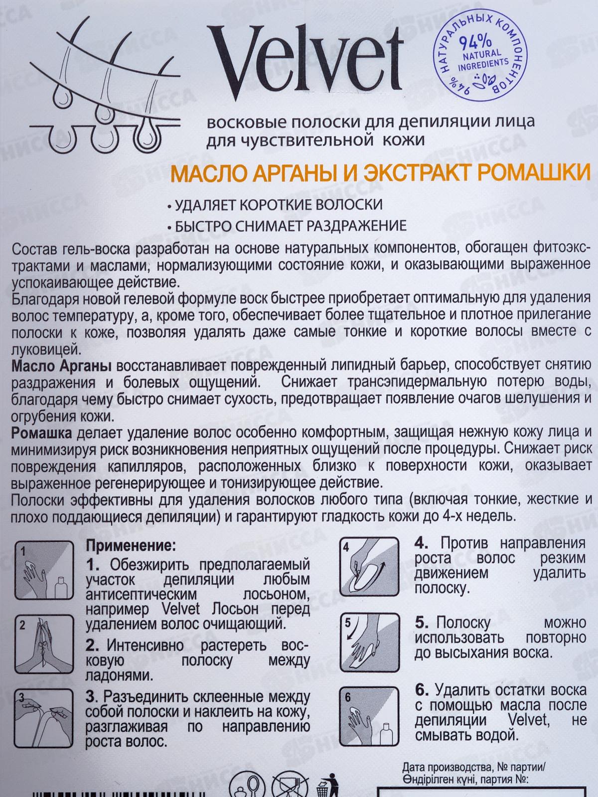 ВЕЛЬВЕТ Восковые полоски для лица чув кожи Масло арганы , ромашка 12шт *24