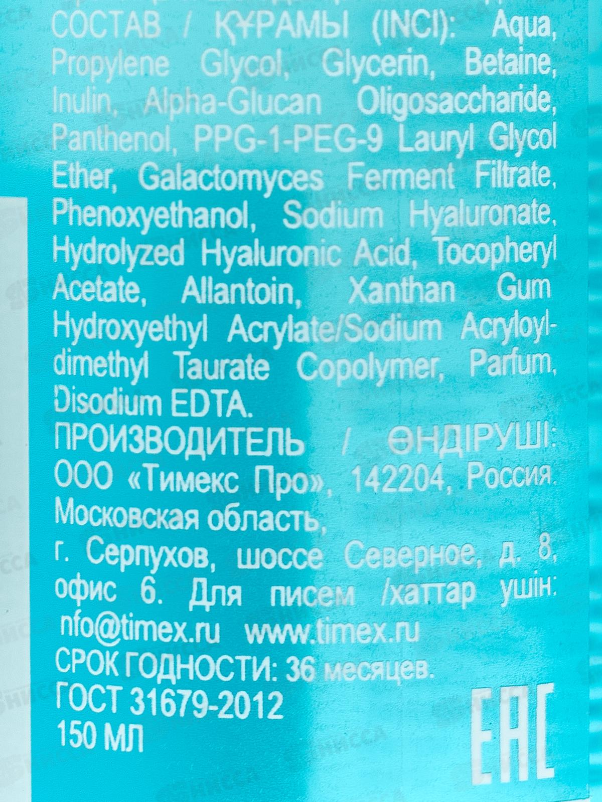 Состав: вода, пропиленгликоль; Глицерин, Бетаин, Инулин; Альфа-глюкан олигосахарид, Пантенол; ППГ-1 ПЕГ-9 лаурилгликолевый эфир; Фильтрат фермента галактомисис, Феноксиэтанол; Гиалуронат Натрия, Гидролизованная Гиалуроновая Кислота; Токоферилацетат (Витамин Е), Аллантоин; ксантановая камедь; гидроксиэтилакрилат/сополимер акрилоилдиметилтаурата натрия; отдушка, динатрий ЭДТА