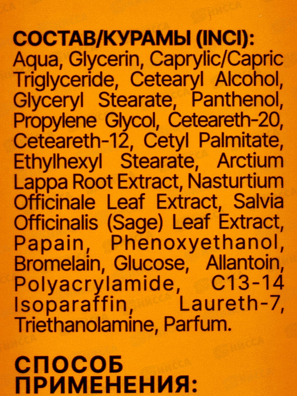 Состав: вода, Глицерин, Каприлик/каприк триглицериды, Цетеариловый спирт, Глицерилстеарат, Пантенол, Пропиленгликоль, Цетеарет-20, Цетеарет-12, Цетилпальмитат, Этилгексилстеарат, Экстракт лопуха, Экстракт настурции, Экстракт шалфея, Папаин, Феноксиэтанол, Бромелайн, Глюкоза, Аллантоин, Полиакриламид, Изопарафин С13-14, Лаурет-7, Триэтаноламин, Отдушка.
