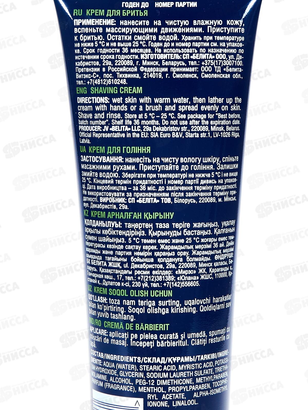 Крем для влажного бритья подходит для всех типов кожи. Образует мягкую устойчивую пену, быстро размягчает волос, делает процесс бритья быстрым и приятным. Содержит комплекс природных веществ, которые увлажняют, смягчают, охлаждают кожу (глицерин, витамин Е, ментол, силиконовое масло). Состав: вода, стеариновая кислота, миристиновая кислота, гидроксид калия, глицерин, триэтаноламин, лауретсульфат натрия, спирт этиловый, ПЭГ-12 диметикон, метилпарабен, парфюмерная композиция, ментол, пропилпарабен, токоферилацетат, альфа-изометилионон, линалол.