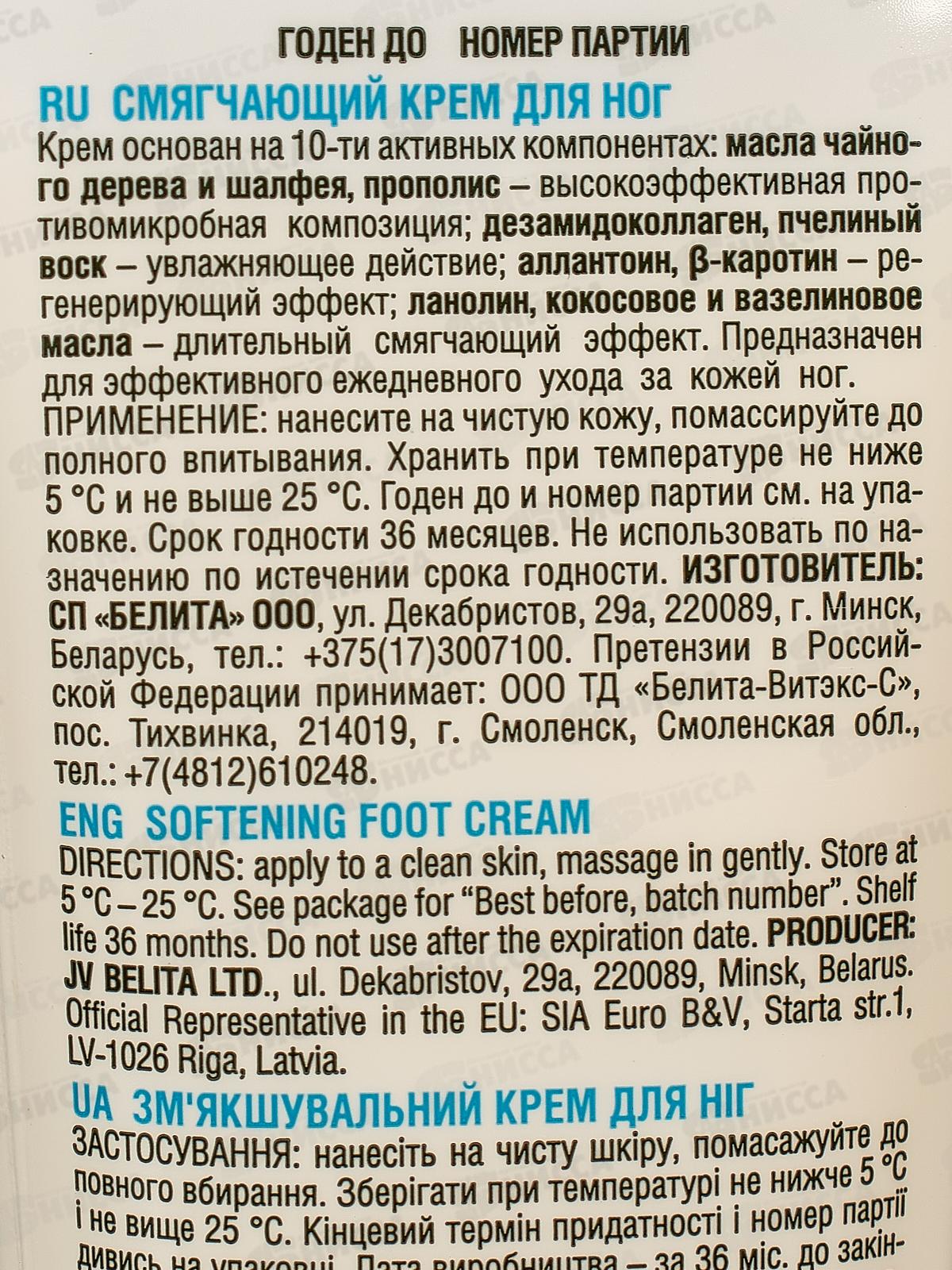 Крем основан на 10-ти активных компонентах. Предназначен для эффективного ежедневного ухода за кожей ног. Состав: Вода, масло вазелиновое, глицерин, ПЭГ-100 стеарат, цетеариловый спирт, воск пчелиный синтетический, глицерилстеарат, дезамидоколлаген, эмульсионный воск, масло Cocos Nucifera (кокоса), ланолин, аллантоин, масло листьев Melaleuca Alternifolia (чайного дерева), экстракт прополиса, метилпарабен, пропилпарабен, масло Salvia Officinalis (шалфея), бета-каротин, 2-бром-2-нитропропан-1,3-диол.