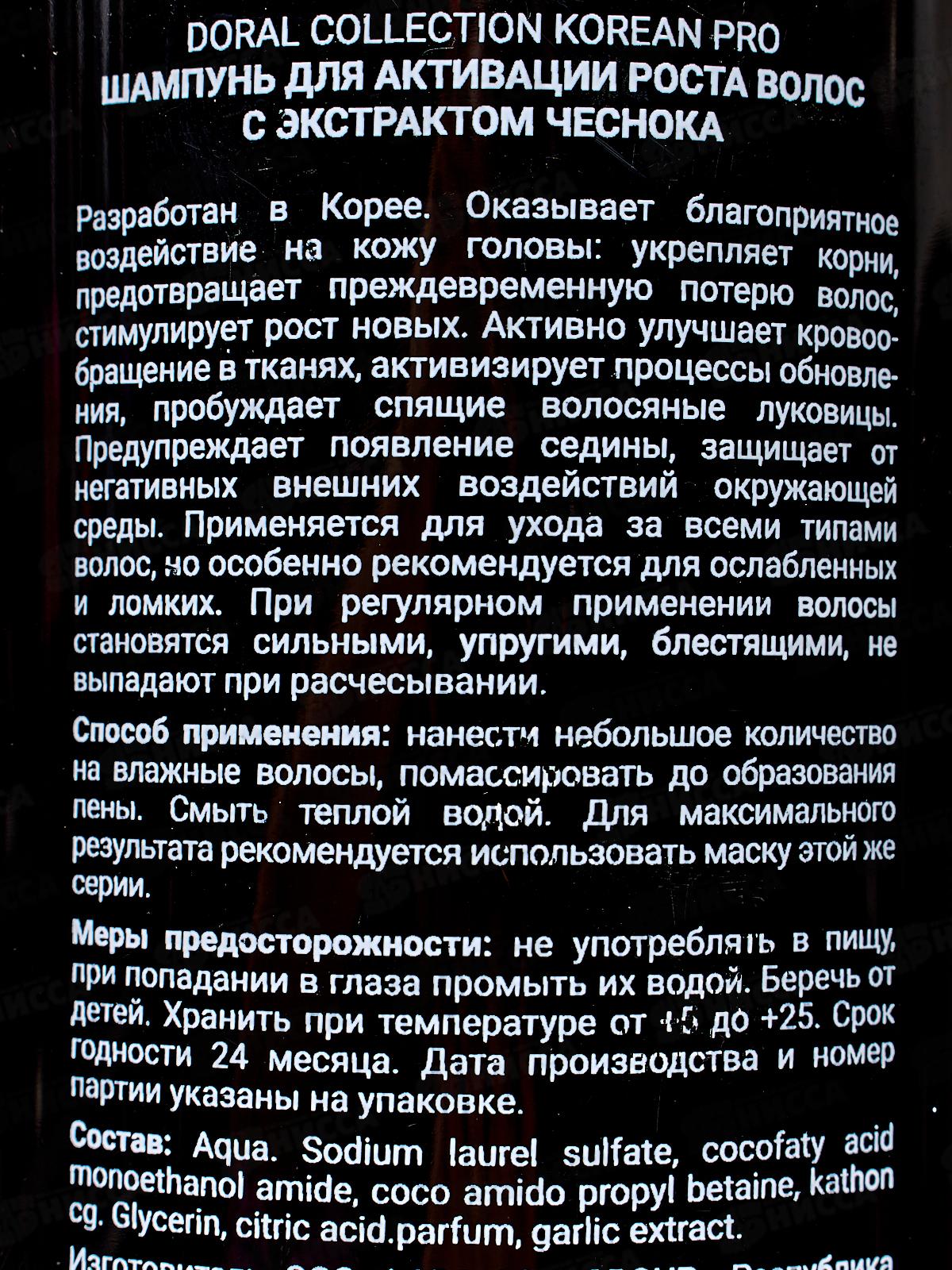 Разработан в Корее. Оказывает благоприятное воздействие на кожу головы: укрепляет корни, предотвращает преждевременную потерю волос, стимулирует рост новых. Активно улучшает кровообращение в тканях, активизирует процессы обновления, пробуждает спящие волосяные луковицы. Предупреждает появление седины, защищает от негативных внешних воздействий окружающей среды. Применяется для ухода за всеми типами волос, но особенно рекомендуется для ослабленных и ломких. При регулярном применении волосы становятся сильными, упругими, блестящими, не выпадают при расчесывании. Состав: Аqua, Sodium laurel sulfate, cocofaty acid, monoethanol amide, coco amido propyl betaine, kathoncg. Glycerin, citric acid.parfum, garlic extract.