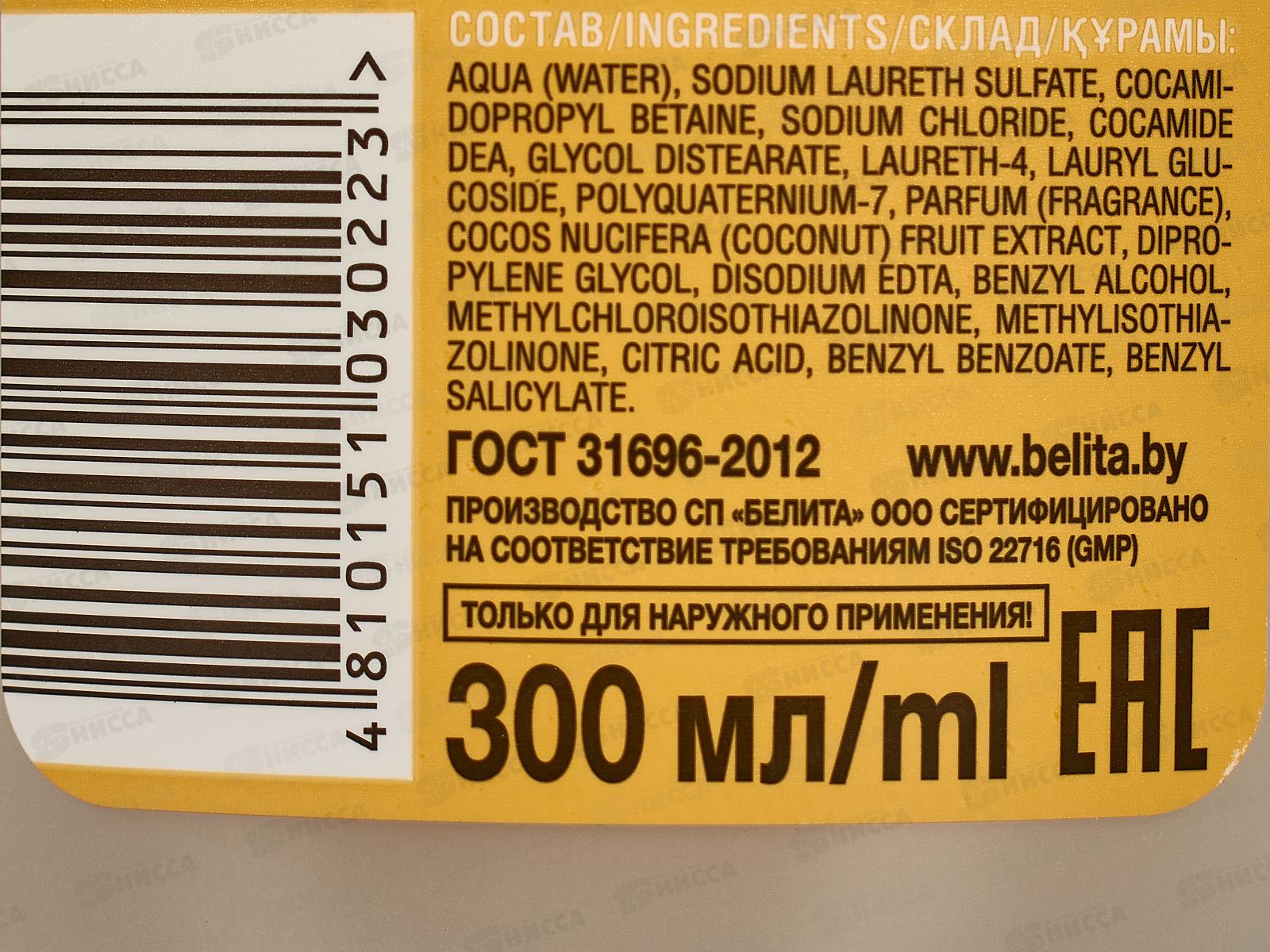 Насыщенный тропический аромат вдохновит вас вспомнить тропические пейзажи, кристально чистую воду и отдых. Ароматная и душистая кокосовая пена наполнит ванну прекрасным ароматом. Состав: вода, лауретсульфат натрия, кокамидопропилбетаин, хлорид натрия, кокамид ДЭА, гликольдистеарат, лаурет-4, кокамидопропилбетаин, лаурилглюкозид, кокамидопропилбетаин, поликватерниум-7, парфюмерная композиция, дипропиленгликоль, ЭДТА динатрия, бензиловый спирт, метилхлоризотиазолинон, метилизотиазолинон, кислота лимонная, экстракт плодов Cocos Nucifera (кокоса), бензилбензоат, бензилсалицилат.