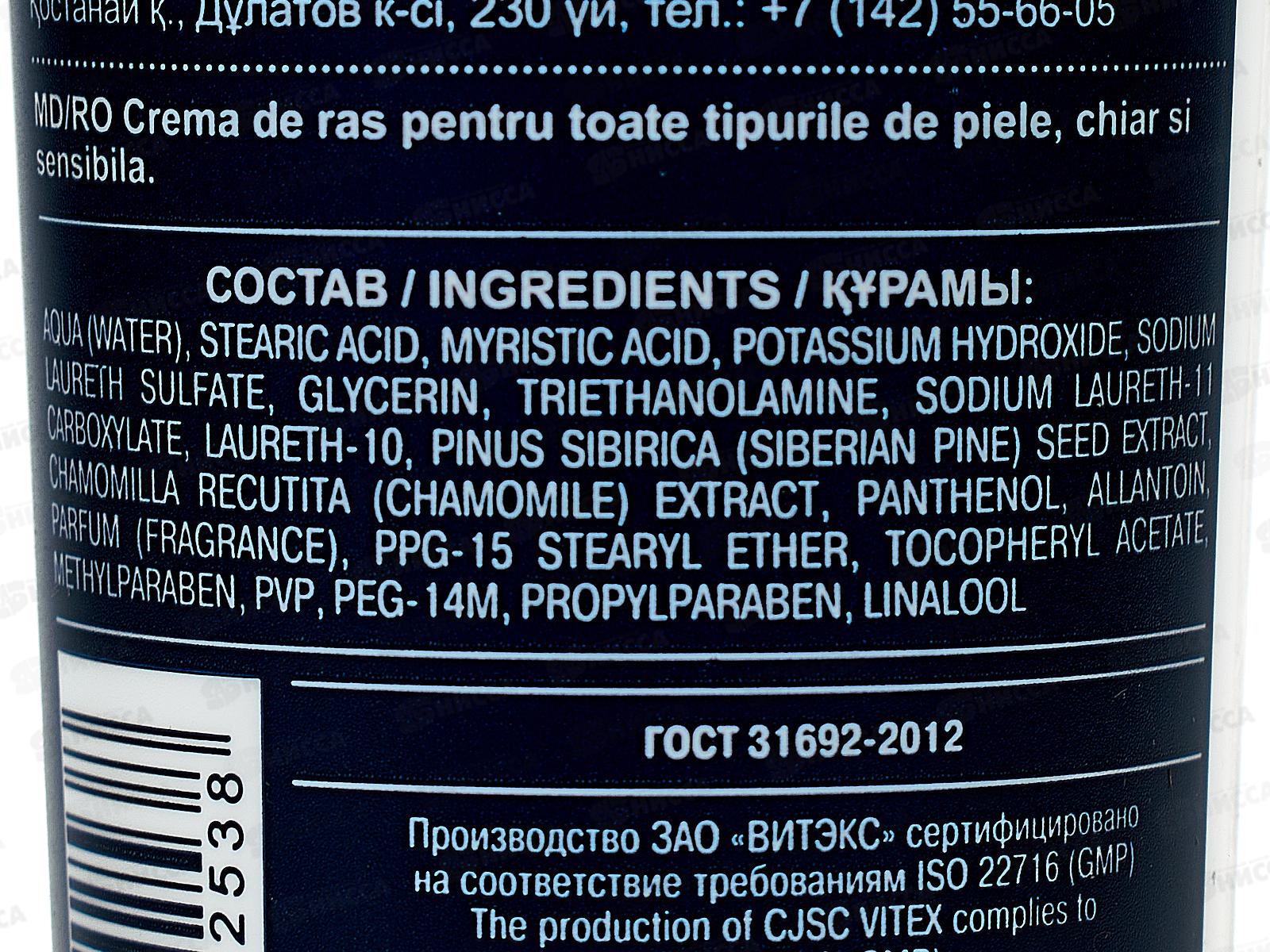 Крем для бритья от Витэкс, созданный с использованием современной технологии ЛЕГКОГО СКОЛЬЖЕНИЯ, – идеальный выбор для мужчин, которым важен абсолютный комфорт во время бритья. Состав: вода, стеариновая кислота, миристиновая кислота, гидроксид калия, глицерин, лауретсульфат натрия, триэтаноламин, экстракт Chamomilla Recutita (ромашки), экстракт семян Pinus sibirica (кедра сибирского), аллантоин, пантенол, токоферилацетат, лаурет-11 карбоксилат натрия, лаурет-10, ППГ-15 стеариловый эфир, парфюмерная композиция, метилпарабен, пропилпарабен, ПЭГ-14М, линалол.