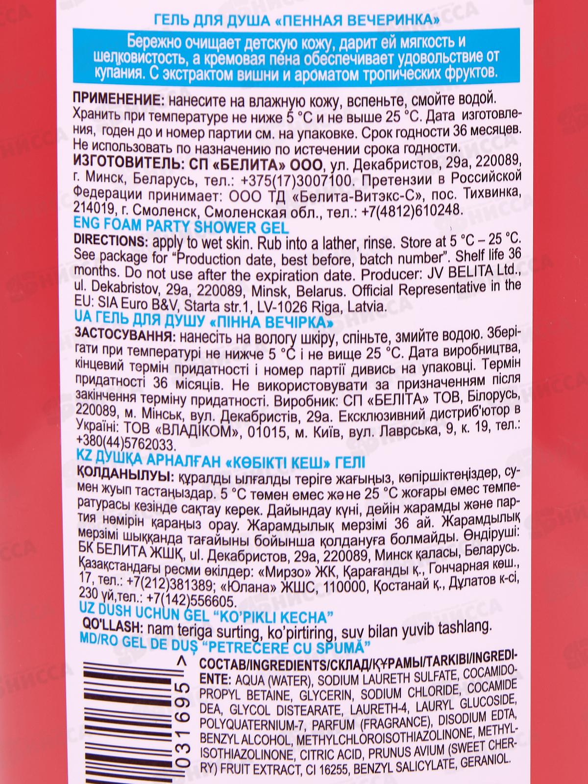 Нежная формула геля для душа деликатно очищает и увлажняет детскую кожу, оставляя ее мягкой и шелковистой. Экстракт вишни прекрасно питает и освежает кожу, придавая ей гладкость и упругость. Невероятная кремовая пена и восхитительный аромат тропических фруктов позволяют окунуться в атмосферу радости и веселья. Состав: вода, лауретсульфат натрия, кокамидопропилбетаин, глицерин, хлорид натрия, кокамид ДЭА, гликольдистеарат, лаурет-4, кокамидопропилбетаин, лаурилглюкозид, кокамидопропилбетаин, поликватерниум-7, парфюмерная композиция, ЭДТА динатрия, бензиловый спирт, метилхлоризотиазолинон, метилизотиазолинон, кислота лимонная, экстракт плодов Prunus Avium (вишни), краситель красный, бензилсалицилат, гераниол, бутилфенилметилпропиональ.