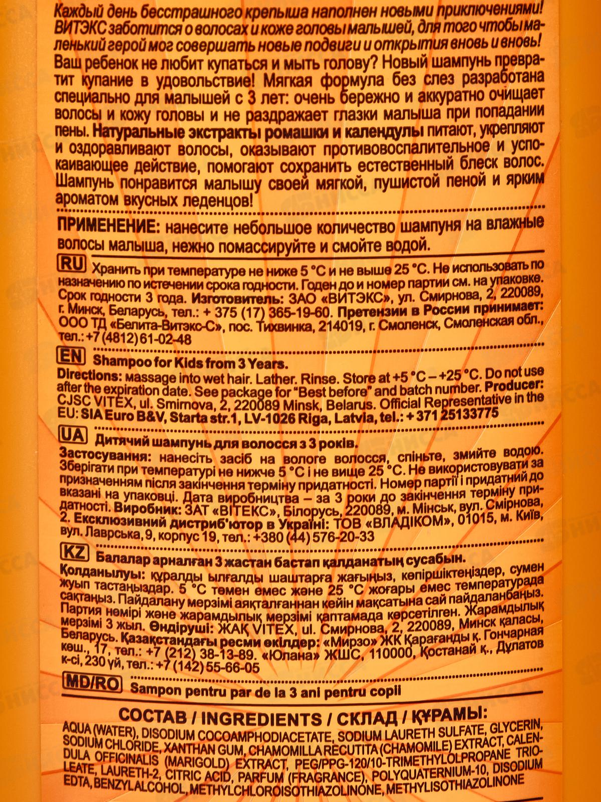 Мягкая формула шампуня разработана специально для малышей c 3 лет. Уникальная формула без слёз не раздражает глазки малыша при попадании пены и превращает купание в приятное удовольствие. Экстракты ромашки и календулы питают и улучшают состояние волос и кожи головы, оказывают противовоспалительное и успокаивающее действие, помогают сохранить естественный блеск волос. Состав: вода, лауретсульфат натрия, кокоамфодиацетат динатрия, глицерин, хлорид натрия, ксантановая камедь, экстракт Chamomilla Recutita (ромашки), экстракт Calendula Officinalis (календулы), триолеат ПЭГ/ППГ-120/10-триметилпропана, лаурет-2, лимонная кислота, парфюмерная композиция, ЭДТА динатрия, поликватерниум-10, бензиловый спирт, метилхлоризотиазолинон, метилизотиазолинон.
