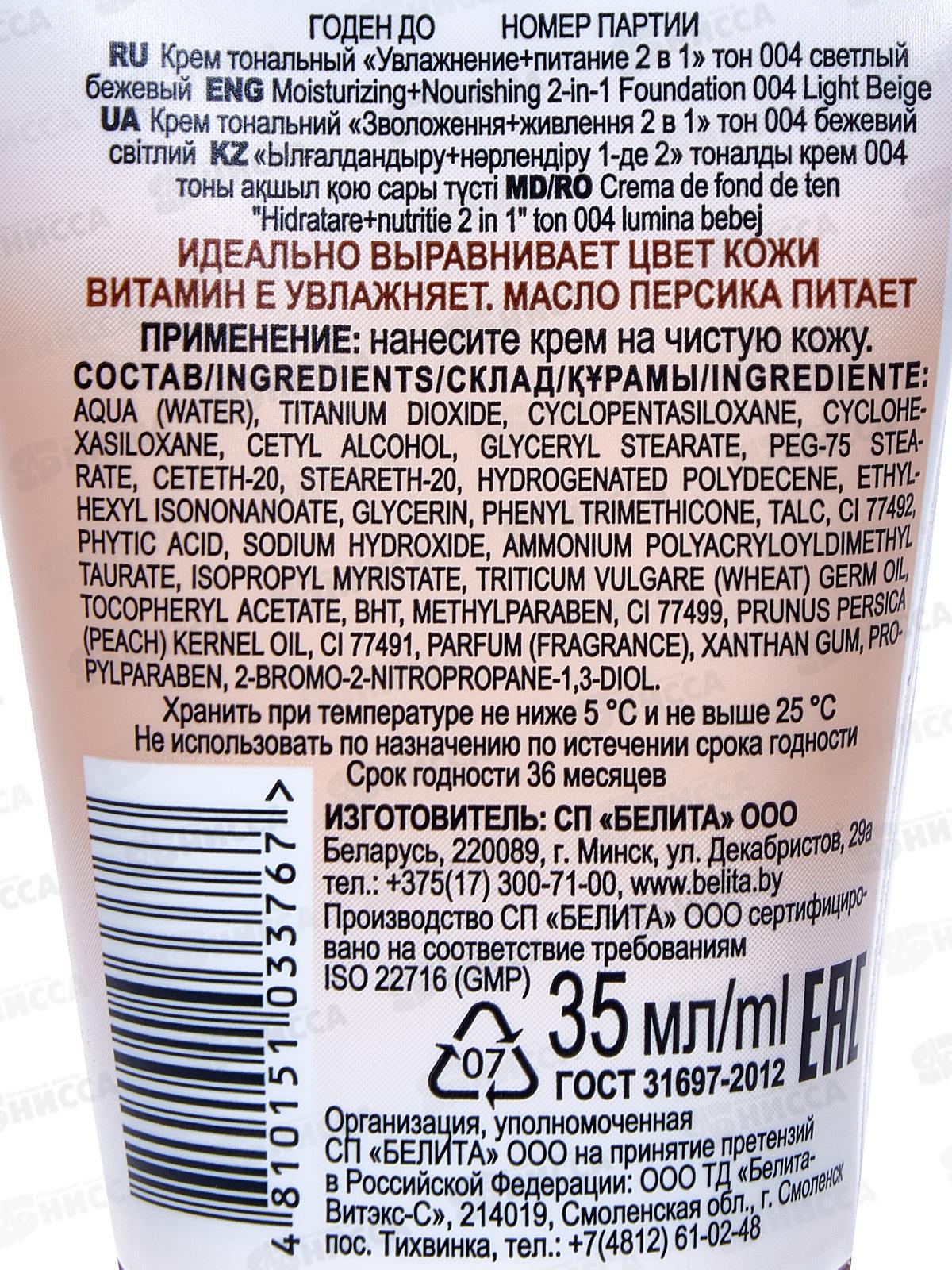 Cl Крем тональный Увлажнение + Питание тон 004(светлый бежевый) 35мл *15