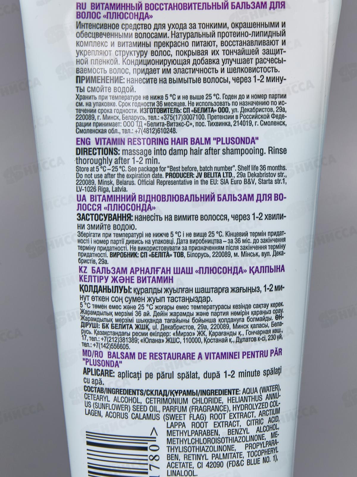Бальзам "PLUSONDA" является незаменимым средством для питания и восстановления волос. Протеины, экстракты лечебных трав и витамины, содержащиеся в данном бальзаме, стимулируют кровообращение и улучшают обменные процессы в коже головы, укрепляют кутикулу волос и регенерируют их поверхность. Состав: вода, цетеариловый спирт, хлорид цетримония, масло Helianthus Annuus (подсолнечное), парфюмерная композиция, гидролизованный коллаген, экстракт Acorus Calamus (аира), экстракт корня Arctium Lappa (лопуха), кислота лимонная, метилпарабен, бензиловый спирт, метилхлоризотиазолинон, метилизотиазолинон, пропилпарабен, ретинилпальмитат, токоферилацетат, краситель синий, линалол.