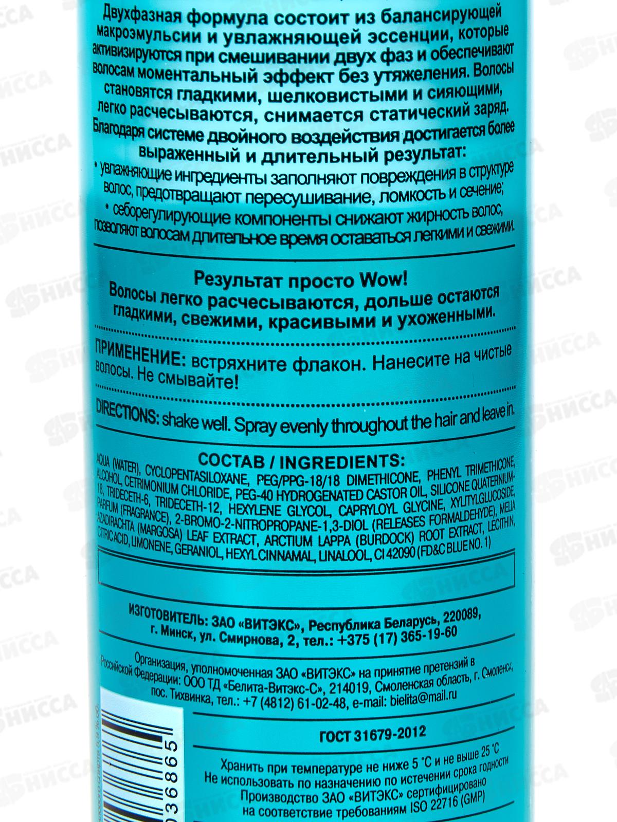 Двухфазная формула состоит из балансирующей макроэмульсии и увлажняющей эссенции, которые активизируются при смешивании двух фаз и обеспечивают волосам моментальный эффект без утяжеления. Волосы становятся гладкими, шелковистыми и сияющими, легко расчесываются, снимается статический заряд. Состав: Вода, циклопентасилоксан, ПЭГ/ППГ-18/18 диметикон, фенилтриметикон, этанол, хлорид цетримония, ПЭГ-40 гидрогенизированное касторовое масло, силикон кватерниум-18, тридецет-6, тридецет-12, гексиленгликоль, каприлоилглицин, ксилитилглюкозид, парфюмерная композиция, 2-бром-2-нитропропан-1,3-диол, экстракт листьев Melia Azadirachta (нима), экстракт корня Arctium Lappa (репейника), лецитин, лимонная кислота, лимонен, гераниол, гексилциннамаль, линалол, CI 42090.