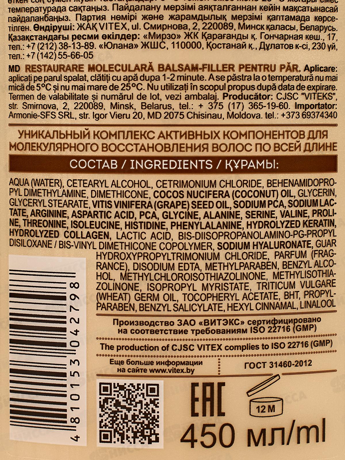 PREMIUM Бальзам-филлер для волос Молекулярное восстановление 450мл *22