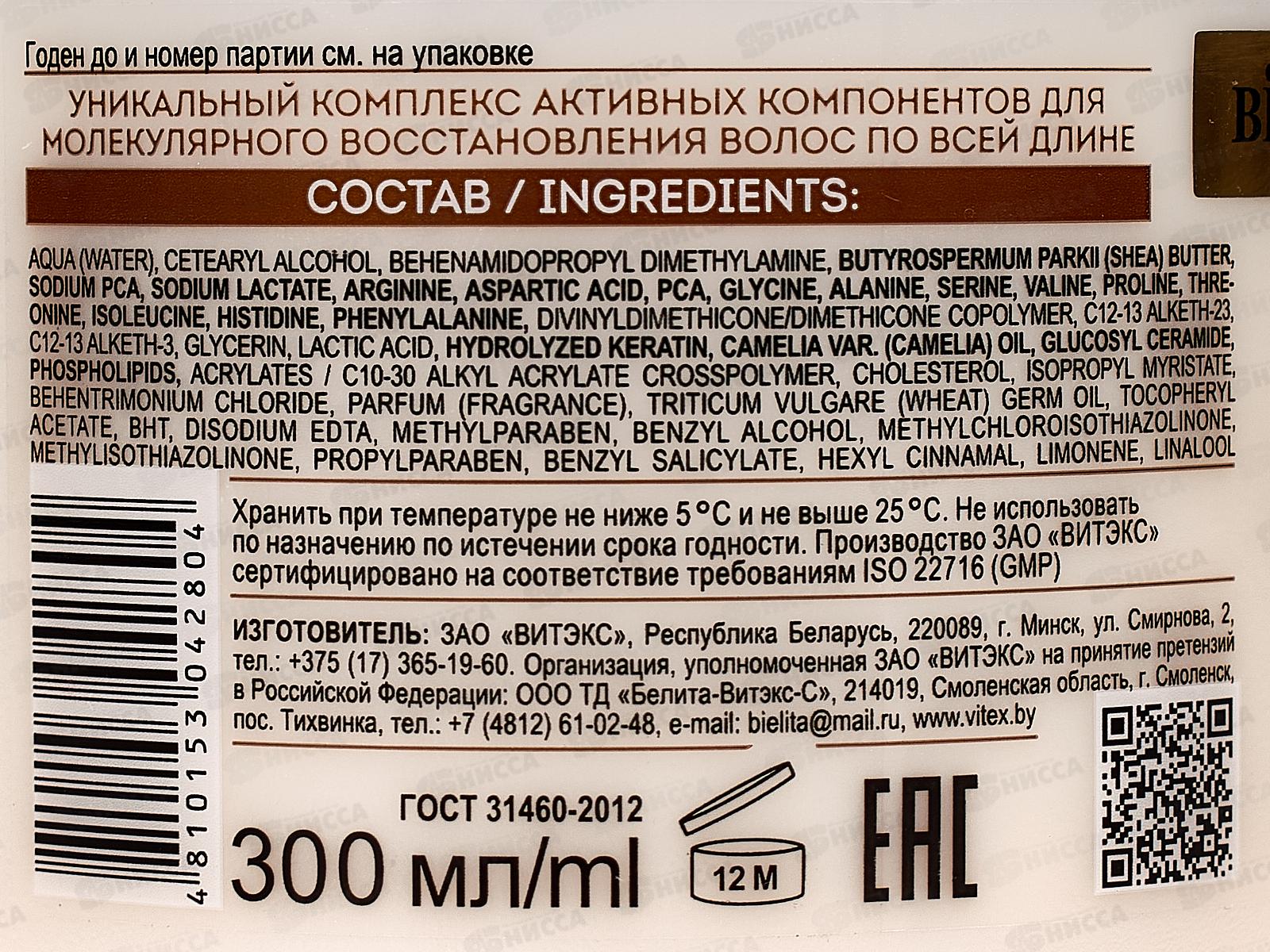 Премиальная формула, в основе которой 11 аминокислот, гидролизованный кератин, масло камелии, масло ши, биоцерамидный комплекс и уникальная система кондиционеров, заполняет поврежденные участки и восстанавливает волосы на молекулярном уровне. Состав: вода, цетеариловый спирт, бегенамидопропилдиметиламин, масло Butyrospermum parkii (ши), пироглутамат натрия, лактат натрия, аргинин, аспаргиновая кислота, пироглутаминовая кислота, глицин, аланин, серин, валин, пролин, треонин, изолейцин, гистидин, фенилаланин, дивинилдиметикон / диметикон сополимер, C12-13 алкет-23, C12-13 алкет-3, глицерин, молочная кислота, гидролизованный кератин, масло Camelia var. (камелии), глюкозилцерамид, фосфолипиды, кроссполимер акрилатов / C10-30 алкилакрилата, холестерол, изопропилмиристат, хлорид бегентримония, парфюмерная композиция, масло зародышей Triticum vulgare (пшеницы), токоферилацетат, БГТ, ЭДТА динатрия, метилпарабен, бензиловый спирт, метилхлоризотиазолинон, метилизотиазолинон, пропилпарабен, бензилсалицилат, гексилциннамаль, лимонен, линалол.
