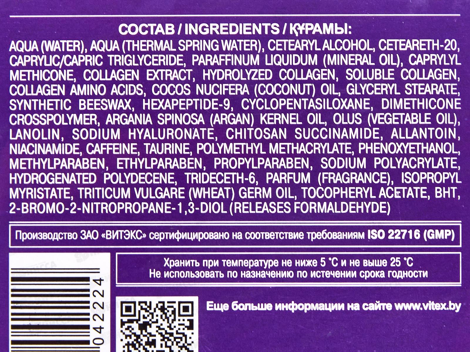 Активная формула крема создана специально для восстановления плотности кожи, заполнения и уменьшения всех видов морщин, укрепление контуров лица в течение всего дня и всей ночи. Состав: вода, термальная вода, цетеариловый спирт, цетеарет-20, глицерилтрикаприлат/капрат, вазелиновое масло, каприлилметикон, экстракт коллагена, гидролизованный коллаген, растворимый коллаген, аминокислоты коллагена, масло Cocos Nucifera (кокосовое), глицерилстеарат, воск пчелиный синтетический, гексапептид-9, циклопентасилоксан, кроссполимер диметикона, масло косточек Argania Spinosa (аргана), растительное масло, ланолин, гиалуронат натрия, сукцинамид хитозана, аллантоин, ниацинамид, кофеин, полиметилметакрилат, феноксиэтанол, метилпарабен, этилпарабен, пропилпарабен, полиакрилат натрия, гидрогенизированный полидецен, тридецет-6, парфюмерная композиция, изопропилмиристат, масло зародышей Triticum vulgare (пшеницы), токоферилацетат, БГТ, таурин, 2-бром-2-нитропропан-1,3-диол.