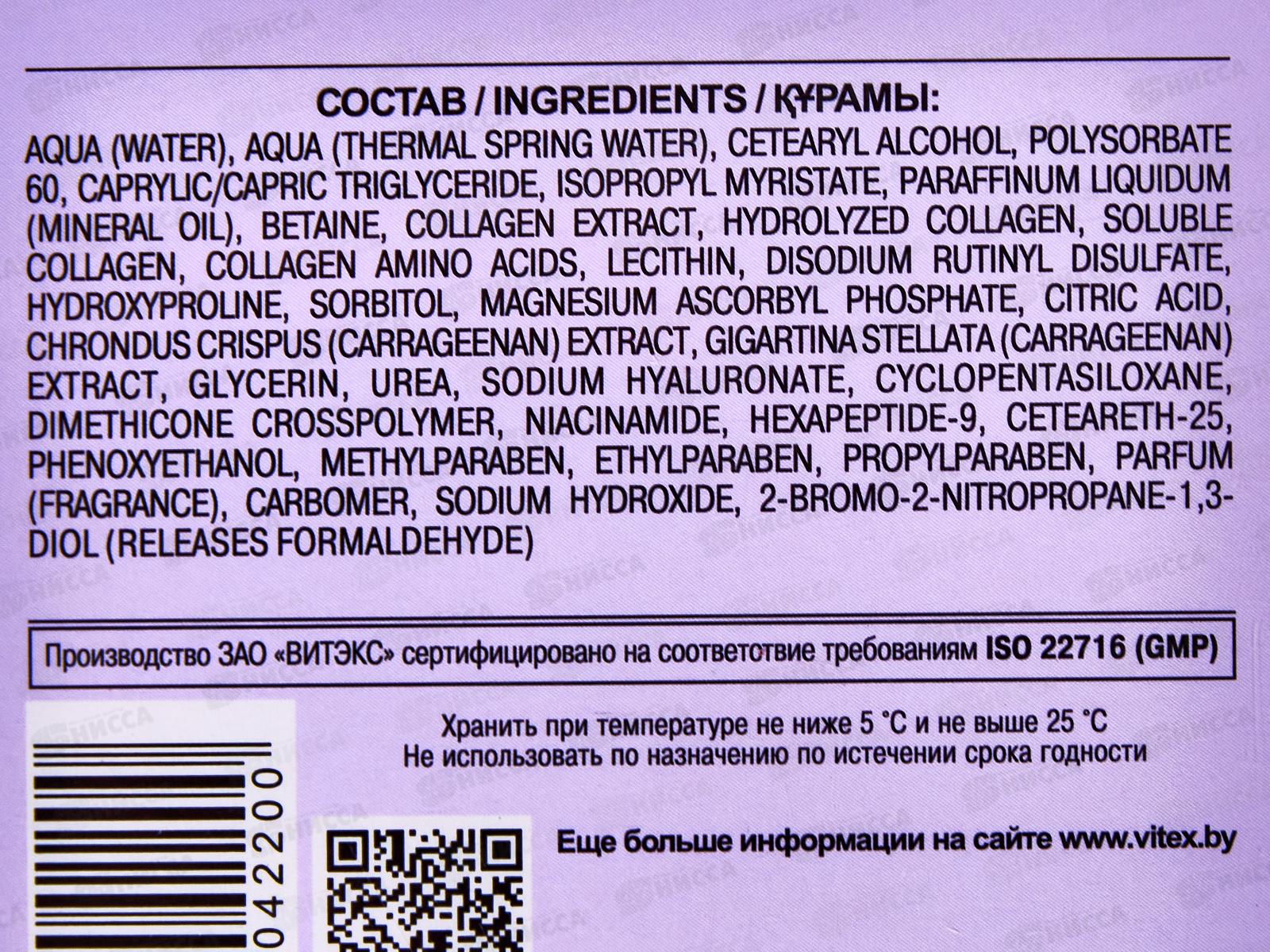 Активная формула крема создана специально для глубокого, продолжительного увлажнения, воссстановления сияния и повышения упругости кожи в течение всего дня и всей ночи. Состав: вода, термальная вода, цетеариловый спирт, полисорбат 60, глицерилтрикаприлат/капрат, изопропилмиристат, вазелиновое масло, бетаин, экстракт коллагена, гидролизованный коллаген, растворимый коллаген, аминокислоты коллагена, лецитин, ретинилдисульфат динатрия, годроксипролин, сорбитол, аскорбилфосфат магния, лимонная кислота, экстракт Chrondus Crispus (карагинана), экстракт Gigartina Stellata (карагинана), глицерин, мочевина, гиалуронат натрия, циклопентасилоксан, кроссполимер диметикона, ниацинамид, гексапептид-9, цетеарет-25, феноксиэтанол, метилпарабен, этилпарабен, пропилпарабен, парфюмерная композиция, карбомер, гидроксид натрия, 2-бром-2-нитропропан-1,3-диол.