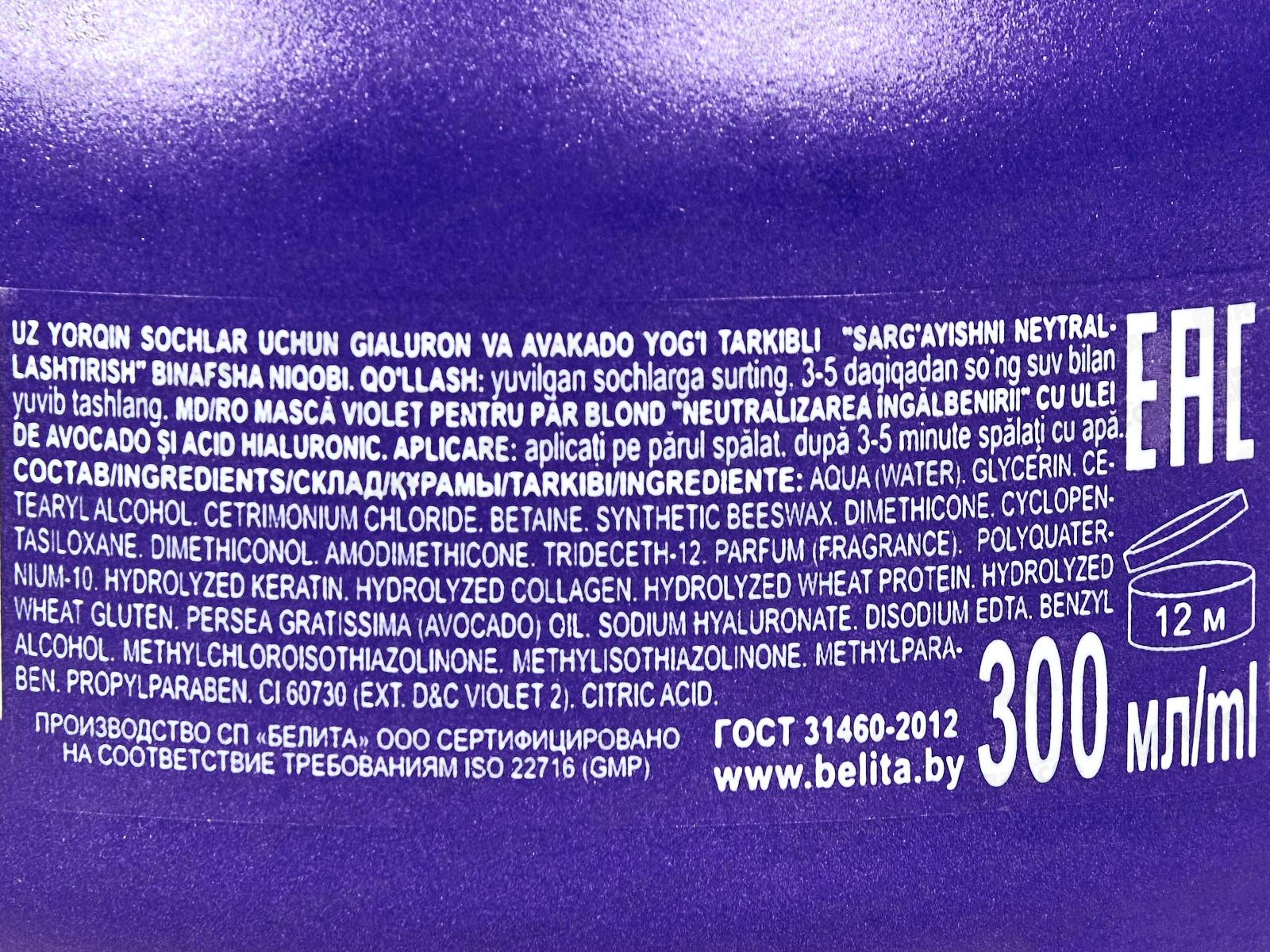Разработана против желтизны для волос с оттенком блонд. Состав: Аква (Вода), Глицерин, Цетеариловый спирт, хлорид цетримония, Синтетический пчелиный воск, Циклопентасилоксан, Диметиконол, Диметикон, Бетаин, Амодиметикон, хлорид цетримония, Тридецет-12, Парфюмированная вода, Поликватерниум-10, Гидролизованный кератин, Гидролизованный коллаген, Гидролизованный пшеничный белок, Гидролизованный пшеничный глютен, Персея щедрая (Авокадо) Масло, Динатриевый ЭДТА, бензиловый спирт, метилхлоризотиазолинон, Метилизотиазолинон, Метилпарабен, CI 60730 (внутр. D&C Violet 2), Лимонная кислота, Пропилпарабен, гиалуронат натрия.