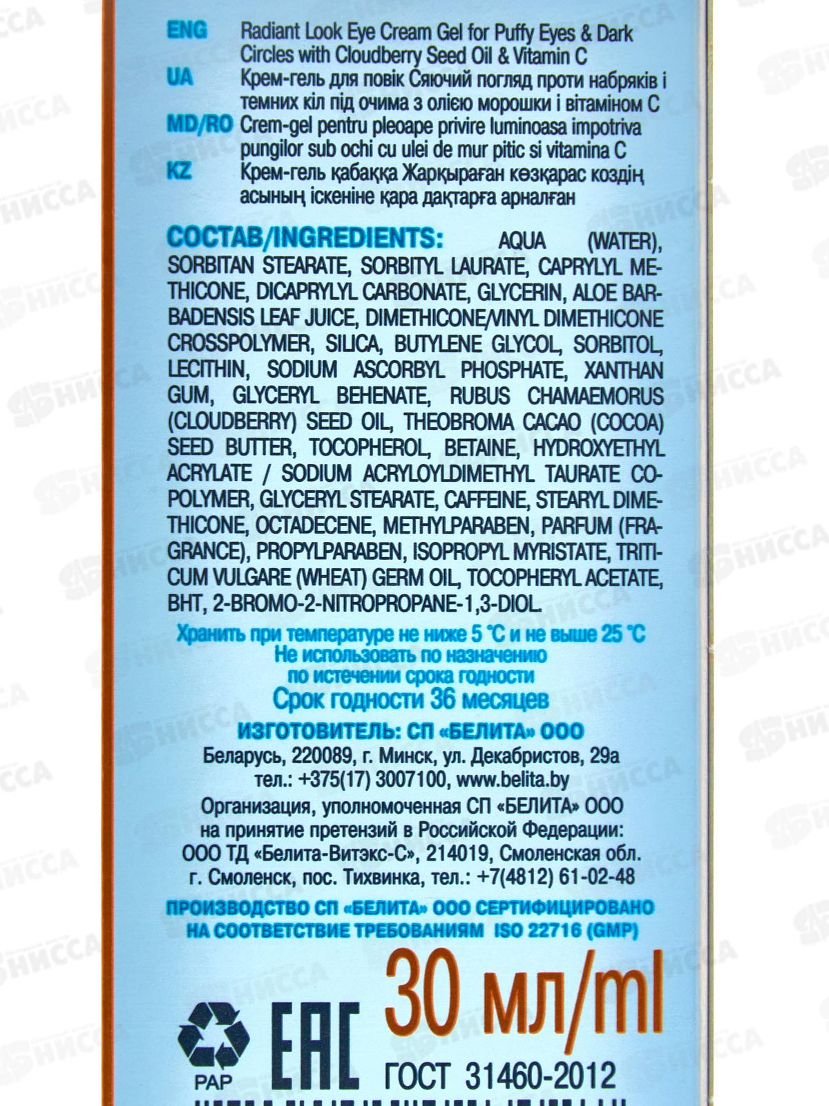 Комплекс активных компонентов, входящий в состав крем-геля, воздействует на кожу по нескольким направлениям: освежает взгляд, уменьшая припухлости под глазами, устраняет темные круги под глазами, придавая притягательное сияние взгляду, разглаживает мелкие морщинки вокруг глаз, обеспечивает длительное увлажнение. Состав: вода, сорбитанстеарат, сорбитиллаурат, каприлилметикон, дикаприлилкарбонат, глицерин, бетаин, кроссполимер диметикона/винилдиметикона, диоксид кремния, бутиленгликоль, глицерилбегенат, масло семян Rubus Chamaemorus (морошки), лецитин, масло семян Theobroma Cacao (какао), ксантановая камедь, токоферол, сок листьев Aloe Barbadensis (алоэ), глицерин, сорбитол, лецитин, аскорбилфосфат натрия, ксантановая камедь, сополимер гидроксиэтилакрилата / акрилоилдиметилтаурата натрия, глицерилстеарат, кофеин, стеарилдиметикон, октадецен, метилпарабен, парфюмерная композиция, ксантановая камедь, изопропилмиристат, масло зародышей Triticum vulgare (пшеницы), токоферилацетат, БГТ, пропилпарабен, 2-бром-2-нитропропан-1,3-диол.