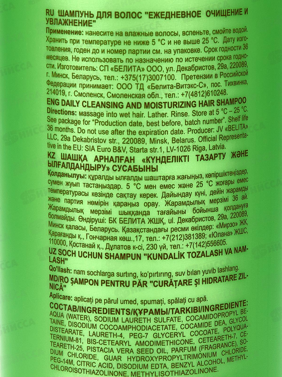 Освежите волосы с шампунем «Ежедневное очищение и увлажнение», обогащенным маслом фисташки. Он глубоко питает и восстанавливает волосы по всей длине, помогая избавиться от ломкости и сечения. Состав: Аква (вода), Лауретсульфат натрия, Кокамидопропилбетаин, Динатриевый кокоамфодиацетат, Кокамид ДЭА, Дистеарат гликоля, Лаурет-4, ПЭГ-7, Глицерил-кокоат, Поликватерниум-81, Бис-цетеариламодиметикон, Цетеарет-7, Цетеарет-25, Масло семян фисташки Вера, Парфюмированная вода, хлорид натрия., Гидроксипропилтримониевый хлорид гуара, ПЭГ-14М, Лимонная кислота, Динатриевый ЭДТА, Бензиловый спирт, метилхлоризотиазолинон, Метилизотиазолинон.