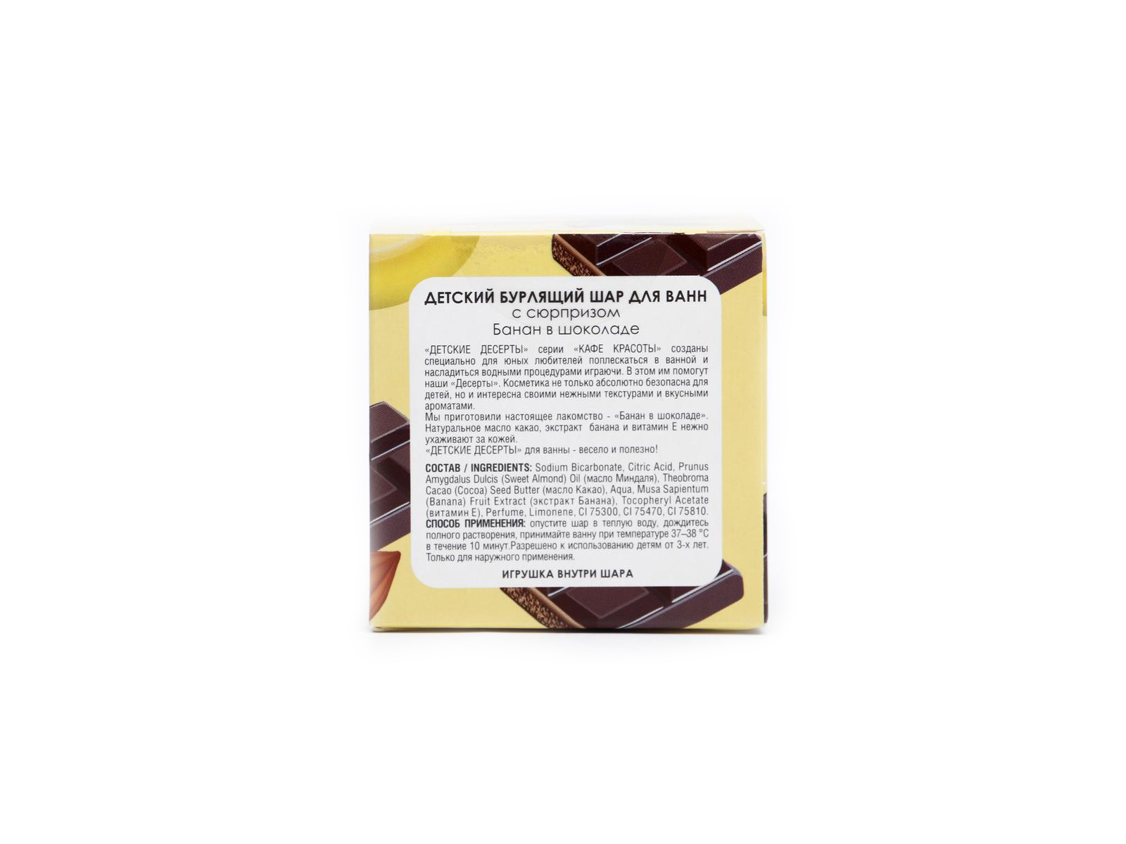 Детский бурлящий шар для ванн с сюрпризом «Банан в шоколаде» нежно ухаживает за чувствительной кожей. С этим средством малышам понравится принимать ванные процедуры. Шар обладает вкусным ароматом, а когда растворяется в воде полностью, ребёнка ждёт сюрприз-игрушка. Безопасен для детской кожи. Активные компоненты: масло какао и миндаля, экстракт банана, витамин Е. Способ применения: опустить шар в тёплую воду, дождаться растворения, купаться 10 минут. Рекомендуется деткам от 3-х лет.