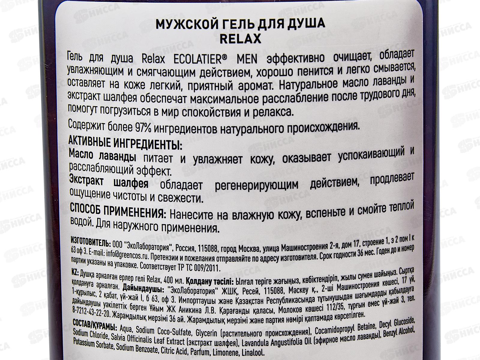 ECOLATIER Мужской гель для душа Relax 400мл 832101 *10