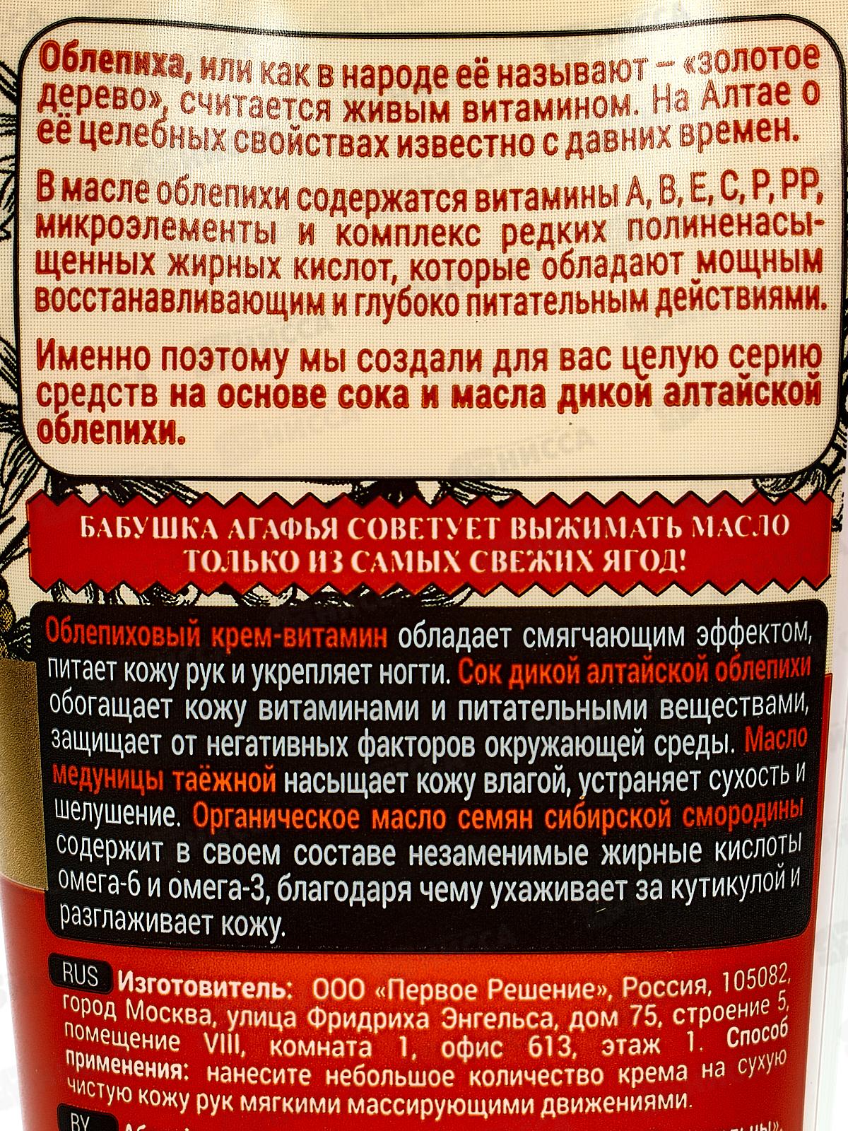 Рецепты Бабушки Агафьи крем для рук и ногтей смягчающий, облепиховый 75мл *24 5044