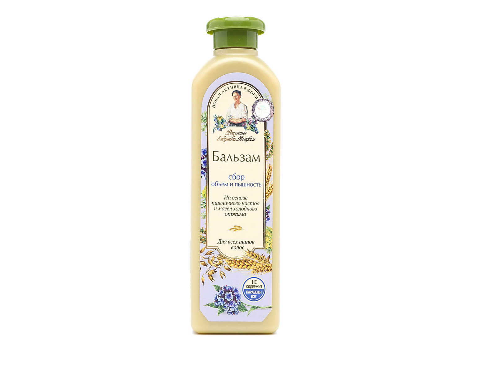Состав: Aqua with infusion of Triticum Vulgare Wheat Bran (вода, настоянная на пшеничных отрубях), enriched by oils: Arctium Lappa (масло репейника), Artemisia Absinthium (масло полыни), Crateegos Monogina (масло боярышника), Меlіlotus Officnalis (масло донника), Extracts: Secale Cereale (рожь), Tussilago Farfara (мать-и-мачеха), Thymus Serpillum (богородская трава), Polygonum Fagopyrum (гречиха), Tilia Соrdata (липовый цвет); Cetnmonium Chloride, Cetearyl Alcohol, Guar (из рожкового дерева), White Beeswax (белым пчелиным воск), Flower Wax (цветочный воск), Pyridoxine HCl (витамин B6), Lenolenic Acid (витаминF), Glucosamine (аминосахариды)‚ Citric Acid, Parfum, Benzoic Acid, Sorbic Acid, Benzyl Alcohol.