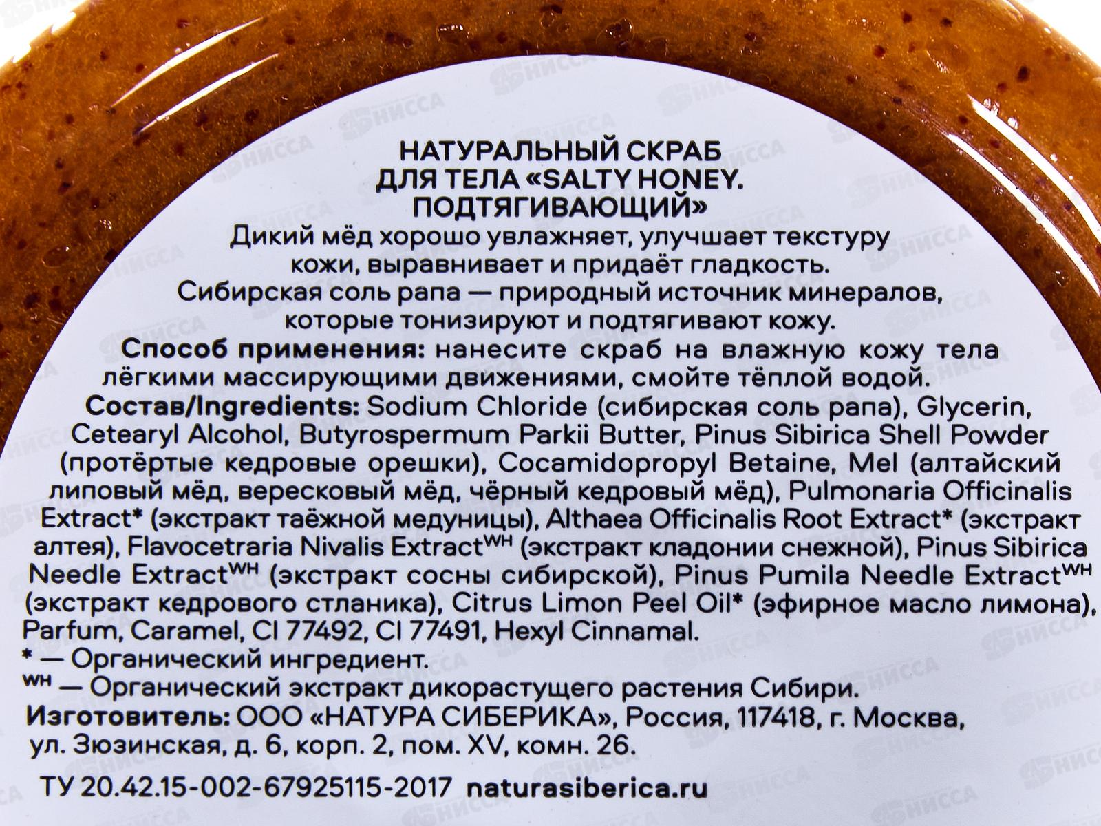 Состав: Sodium Chloride (сибирская соль рапа), Glycerin, Cetearyl Alcohol, Butyrospermum Parkii Butter, Pinus Sibirica Shell Powder (протертые кедровые орешки), Cocamidopropyl Betaine, Mel (алтайский липовый мед, вересковый мёд, чёрный кедровый мёд), Pulmonaria Officinalis Extract* (экстракт таежной медуницы), Althaea Officinalis Root Extract* (экстракт алтея), Flavocetraria Nivalis ExtractWH (экстракт кладонии снежной), Pinus Sibirica Needle ExtractWH (экстракт сосны сибирской), Pinus Pumila Needle ExtractWH (экстракт кедрового стланика), Citrus Limon Peel Oil* (эфирное масло лимона), Parfum, Caramel, CI 77492, CI 77491, Hexyl Cinnamal.