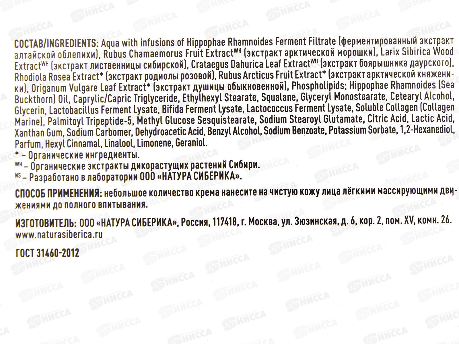Состав: Aqua with infusions of Hippophae Rhamnoides Ferment Filtrate (ферментированный экстракт алтайской облепихи), Rubus Chamaemorus Fruit Extract WH (экстракт арктической морошки), Larix Sibirica Wood Extract WH (экстракт лиственницы сибирской), Crataegus Dahurica Leaf Extract WH (экстракт боярышника даурского), Rhodiola Rosea Extract* (экстракт родиолы розовой), Rubus Arcticus Fruit Extract* (экстракт арктической княженики), Origanum Vulgare Leaf Extract* (экстракт душицы обыкновенной), Phospholipids; Hippophae Rhamnoides (Sea Buckthorn) Oil, Caprylic/Capric Triglyceride, Ethylhexyl Stearate, Squalane, Glyceryl Monostearate, Cetearyl Alcohol, Glycerin, Lactobacillus Ferment Lysate, Bifida Ferment Lysate, Lactococcus Ferment Lysate, Soluble Collagen (Collagen Marine), Palmitoyl Tripeptide-5, Methyl Glucose Sesquistearate, Sodium Stearoyl Glutamate, Citric Acid, Lactic Acid, Xanthan Gum, Sodium Carbomer, Dehydroacetic Acid, Benzyl Alcohol, Sodium Benzoate, Potassium Sorbate, 1,2-Hexanediol, Parfum, Hexyl Cinnamal, Linalool, Limonene, Geraniol.