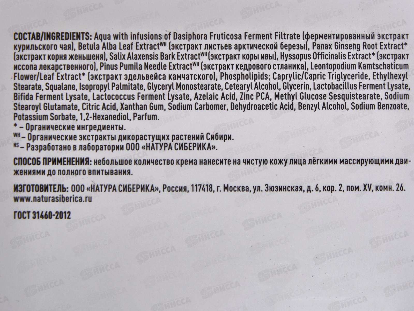 Состав: Aqua with infusions of Dasiphora Fruticosa Ferment Filtrate (ферментированный экстракт курильского чая), Betula Alba Leaf Extract WH (экстракт листьев арктической березы), Panax Ginseng Root Extract* (экстракт корня женьшеня), Salix Alaxensis Bark Extract WH (экстракт коры ивы), Hyssopus Officinalis Extract* (экстракт иссопа лекарственного), Pinus Pumila Needle Extract WH (экстракт кедрового стланника), Leontopodium Kamtschaticum Flower/Leaf Extract* (экстракт эдельвейса камчатского), Phospholipids; Caprylic/Capric Triglyceride, Ethylhexyl Stearate, Squalane, Isopropyl Palmitate, Glyceryl Monostearate, Cetearyl Alcohol, Glycerin, Lactobacillus Ferment Lysate, Bifida Ferment Lysate, Lactococcus Ferment Lysate, Azelaic Acid, Zinc PCA, Methyl Glucose Sesquistearate, Sodium Stearoyl Glutamate, Citric Acid, Xanthan Gum, Sodium Carbomer, Dehydroacetic Acid, Benzyl Alcohol, Sodium Benzoate, Potassium Sorbate, 1,2-Hexanediol, Parfum.