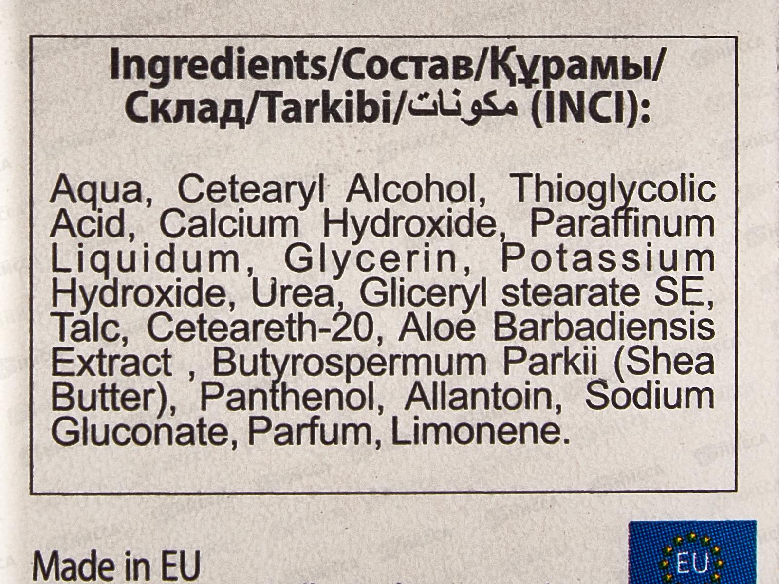 Состав: вода, цетеариловый спирт, тиогликолевая кислота, гидроксид кальция, вазелиновое масло, глицерин, гидроксид калия, мочевина, глицерилстеарат SE, тальк, цетеарет-20, экстракт алоэ вера, масло ши (Butyrospermum Parkii), пантенол, аллантоин, глюконат натрия, отдушка, лимонен.