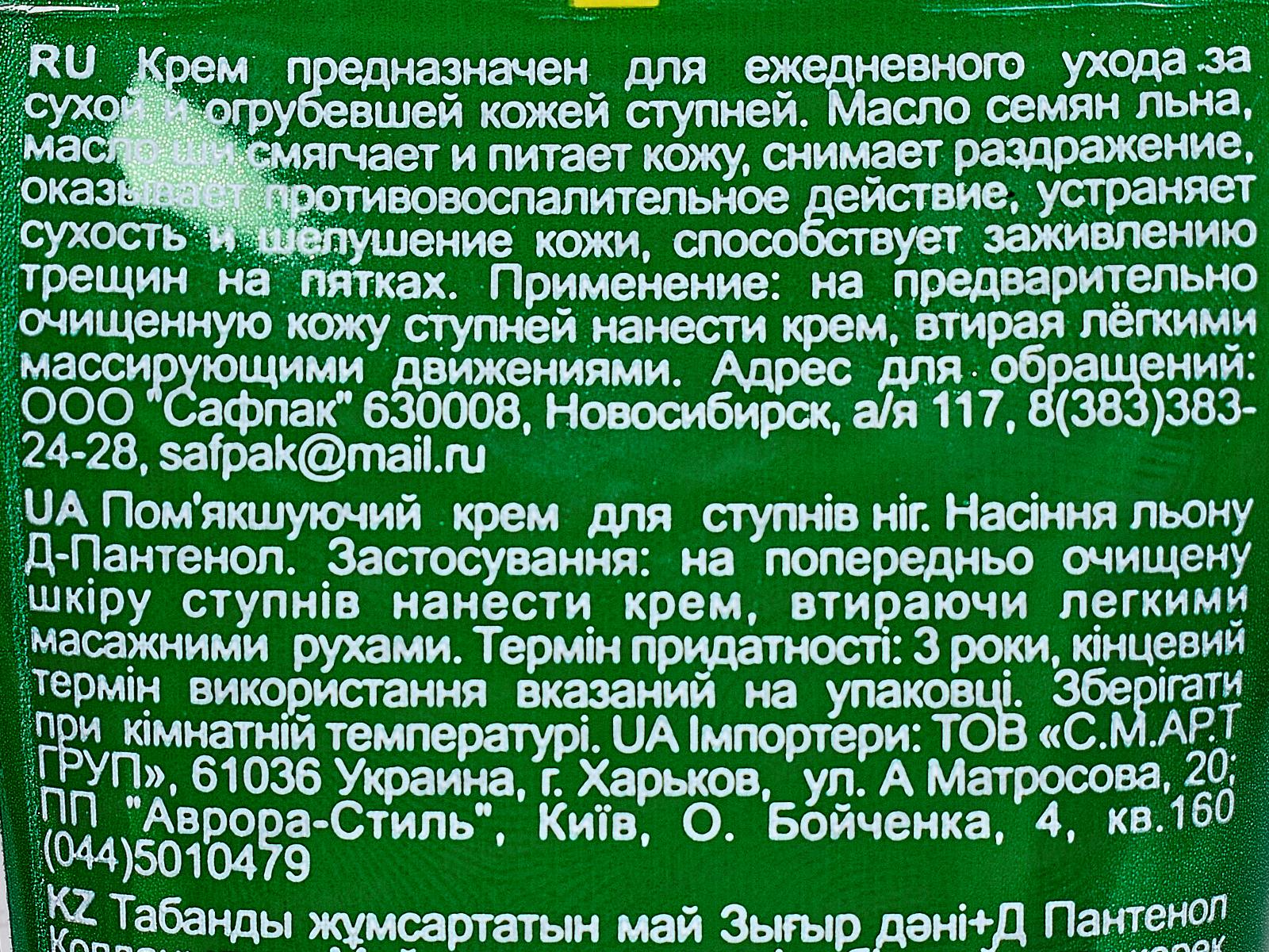 Смягчающий крем для ступней с семенами Льна и Д-пантенолом идеально подходит для ежедневного ухода за сухой, склонной к образованию трещин кожи ступней. Он обеспечивает качественное смягчение, помогает избавиться от малоприятных трещинок и чрезмерной сухости, регенерирует, предупреждает и устраняет микротрещины. Состав: Вода, глицерин, Цетеариловый спирт, Этилгексилкоат, пропиленгликоль, Диметикон, Бутироспермум Паркии (масло ши), Цетеарет-20, Cocos Nucifera (Кокосовый орех). Масло, Минеральное масло, Prunus Amygdalus Dulcis (Сладкий миндаль) Масло, Экстракт цветков ромашки прямостоячей, глицерилстеарат SE, растворимый коллаген, гидролизованный эластин, Мочевина, Экстракт зародышей пшеницы Triticum Vulgare, Лимонная кислота, аллантоин, Кроссполимер алкилакрилата C10-30, триэтаноламин, токоферилацетат (витамин Е), Тетранатриевый ЭДТА, бензоат натрия, сорбат калия, Сорбиновая кислота, Парфюмерная композиция