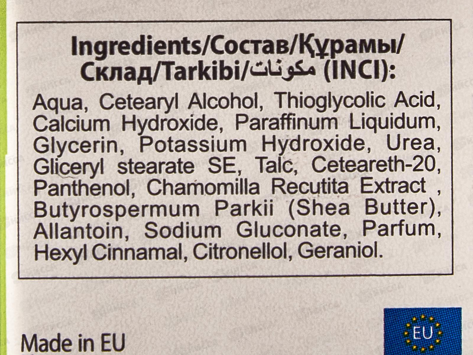 Результат: Ощущение непревзойдённой гладкости и абсолютного комфорта после депиляции. Препарат сильнодействующий. Содержит щёлочь и тиогликолят. Используйте крем в соответствии с инструкцией применения. Ультра нежный крем для быстрой и безболезненной депиляции, можно применять для депиляции лица. Состав: Вода, минеральное масло, Цетеариловый спирт, Цетеарет-20, глицерилстеарат, мочевина, Тиоглиевая кислота, гидроксид кальция, гидроксид калия, пропиленгликоль, пантенол, Экстракт Алоэ барбадосского, Larrea Divaricata, Парфюмированная вода.