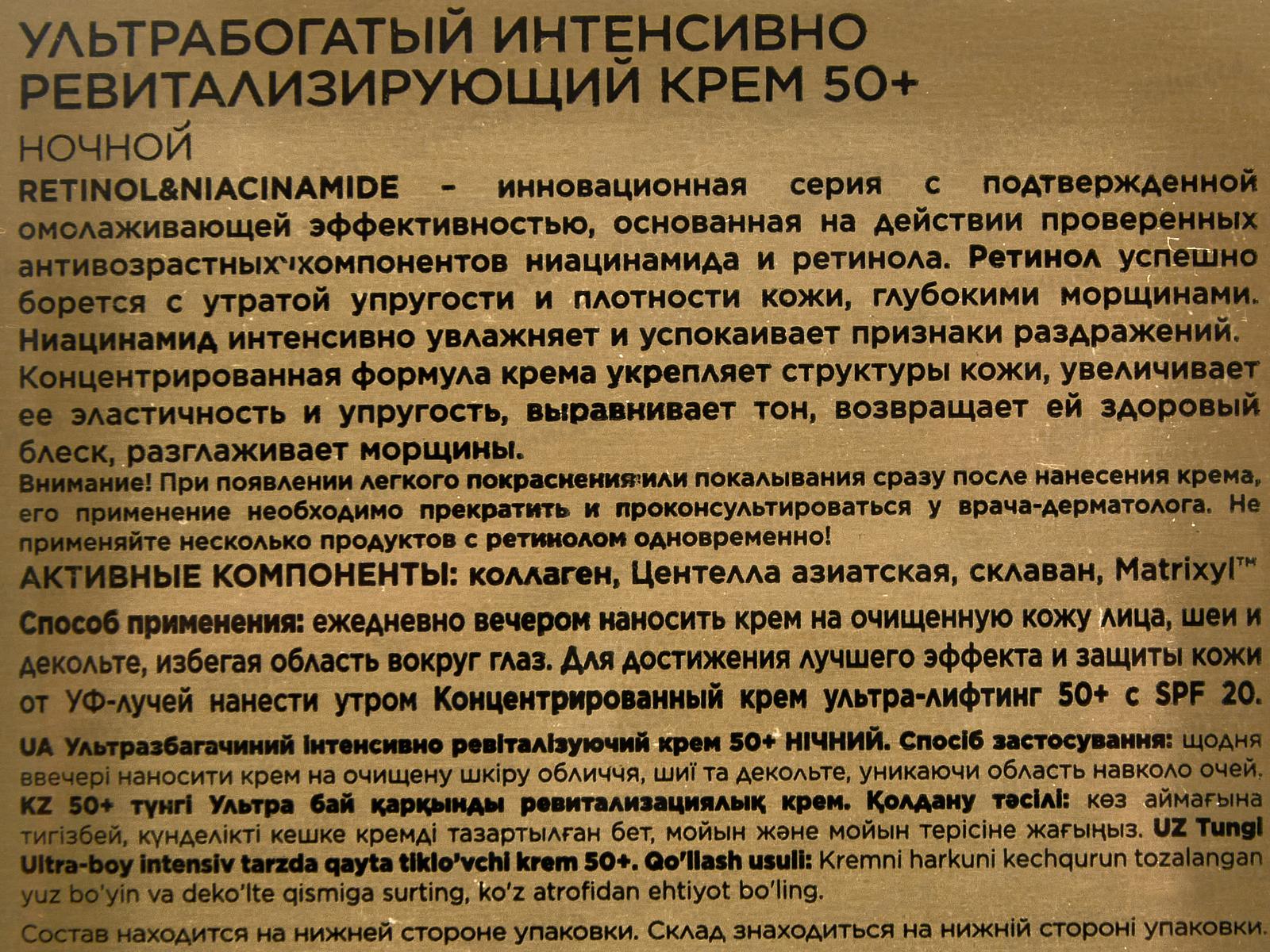 УЛЬТРАБОГАТЫЙ ИНТЕНСИВНО РЕВИТАЛИЗИРУЮЩИЙ КРЕМ 50+ НОЧНОЙ RETINOL&NIACINAMIDE – инновационная серия с подтвержденной омолаживающей эффективностью, основанная на действии проверенных антивозрастных компонентов ниацинамида и ретинола. Состав: Aqua (Water), Glycerin, Cetearyl Alcohol, Ethylhexyl Stearate, Caprylic/Capric Triglyceride, Butyrospermum Parkii Butter, Isopropyl Myristate, Behenyl Alcohol, Cocos Nucifera Oil, Pentaerythrityl Distearate, Centella Asiatica Leaf Extract, Betaine, Retinol, Niacinamide, Vegetable Collagen, Palmitoyl Tripeptide-1, Palmitoyl Tetrapeptide-7, Squalane, Tocopheryl Acetate, Sodium Lactate, Hydroxyacetophenone, Phenoxyethanol, Ethylhexylglycerin, Sodium Benzoate, Disodium Cetearyl Sulfosuccinate, Hydroxypropyl Cyclodextrin, Leuconostoc/Radish Root Ferment Filtrate, Coco-Glucoside, Butylene Glycol, Sodium Polyacrylate, Carbomer, Xanthan Gum, Parfum (Fragrance), Disodium EDTA, Citric Acid, Coumarin, Limonene, Geraniol, Hexyl Cinnamal, Linalool.