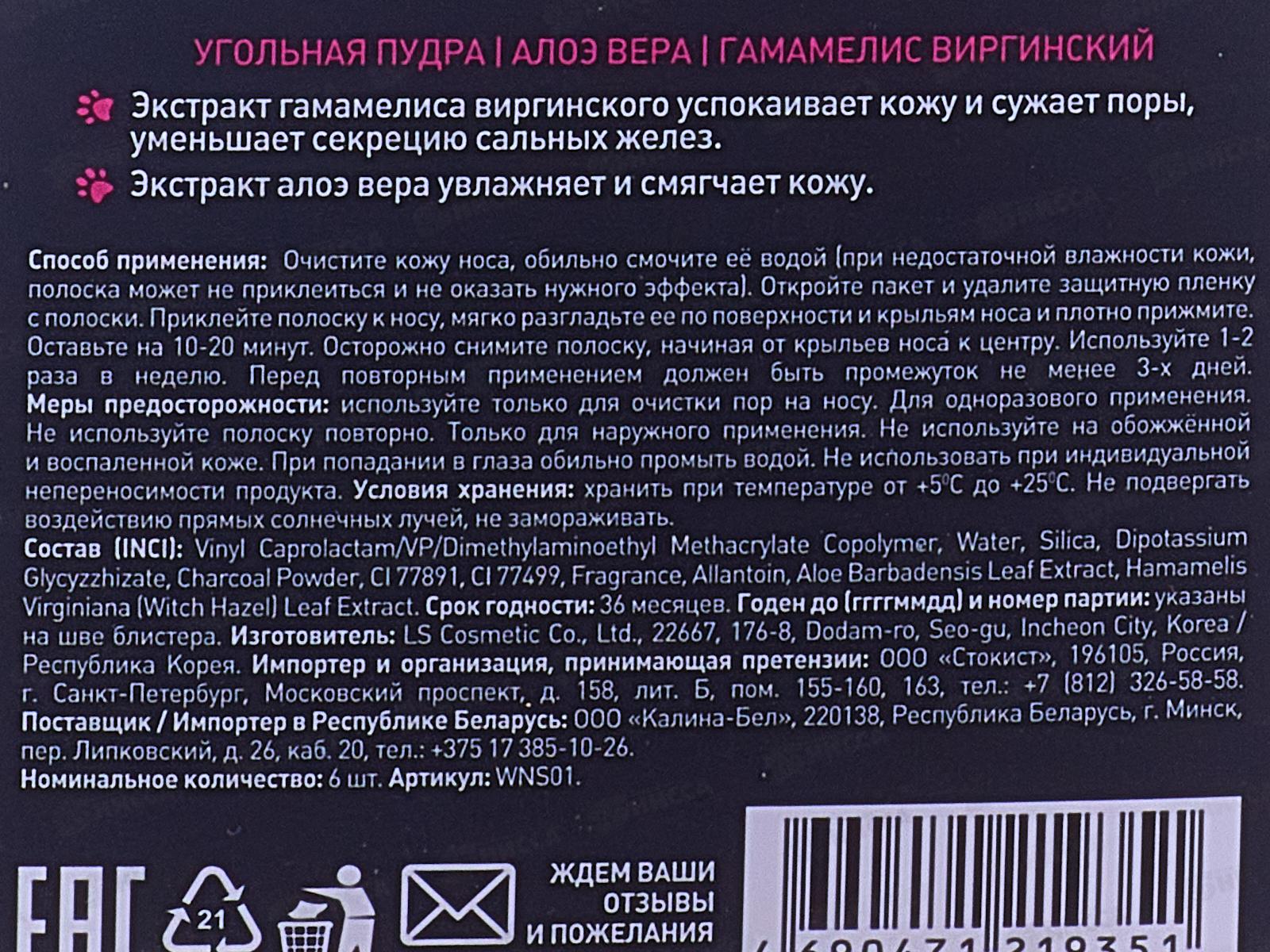 Очищающие полоски для носа WEIS с угольной пудрой - это эффективное средство для борьбы с черными точками. Состав: Vinyl Caprolactam/VP/Dimethylaminoethyl Methacrylate Copolymer, Water, Silica, Dipotassium Glycyzzhizate, Charcoal Powder, CI 77891, CI 77499, Fragrance, Allantoin, Aloe Barbadensis Leaf Extract, Hamamelis Virginiana (Witch Hazel) Leaf Extract.
