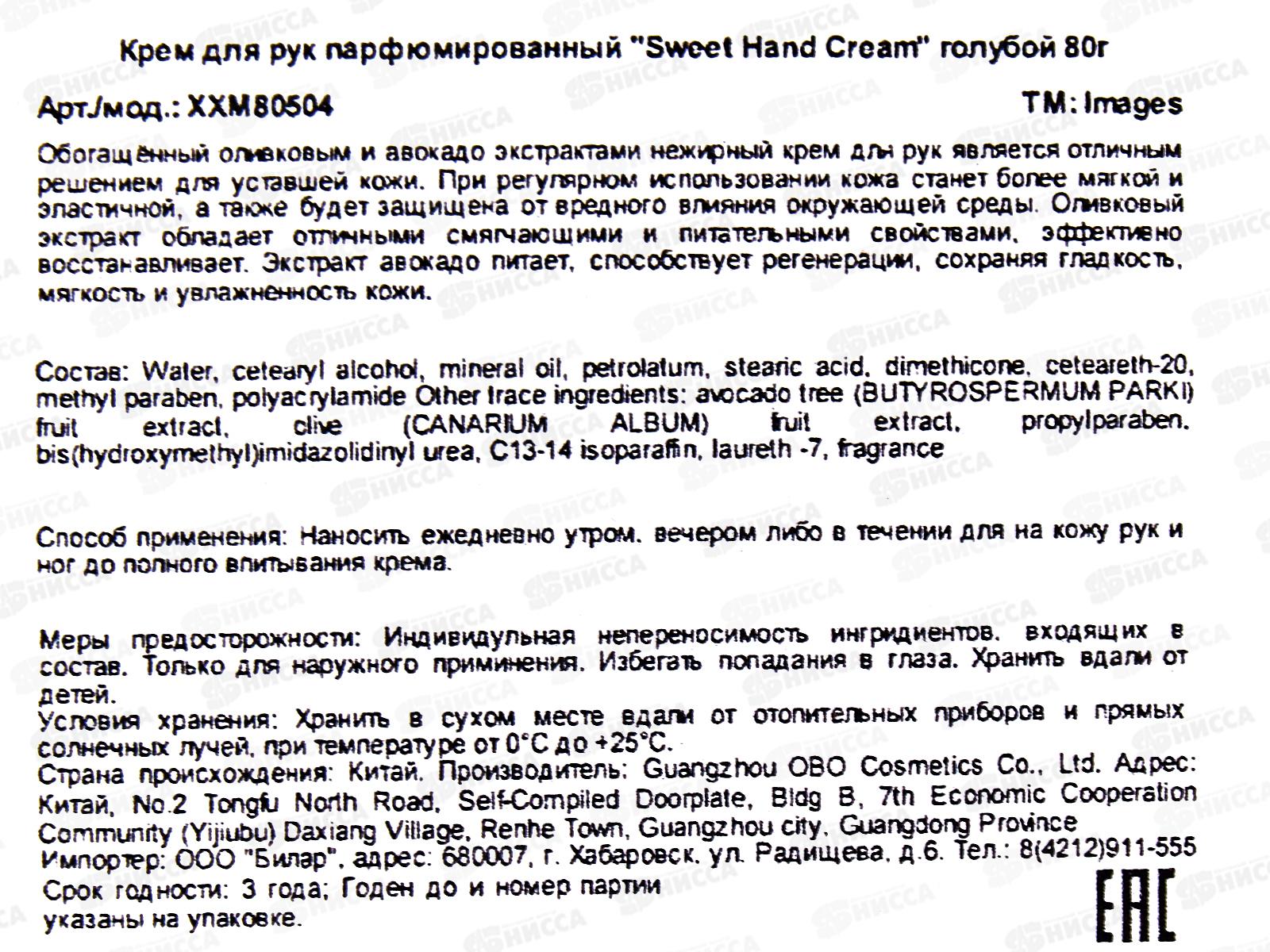 Состав: вода, цетеариловый спирт, минеральное масло, вазелин, стеариновая кислота, Диметикон, цетеарет 20, метилпарабен, полиакриламид, экстракт плодов дерева авокадо, экстракт плодов оливы, пропилпарабен, отдушка, экстракт ши.