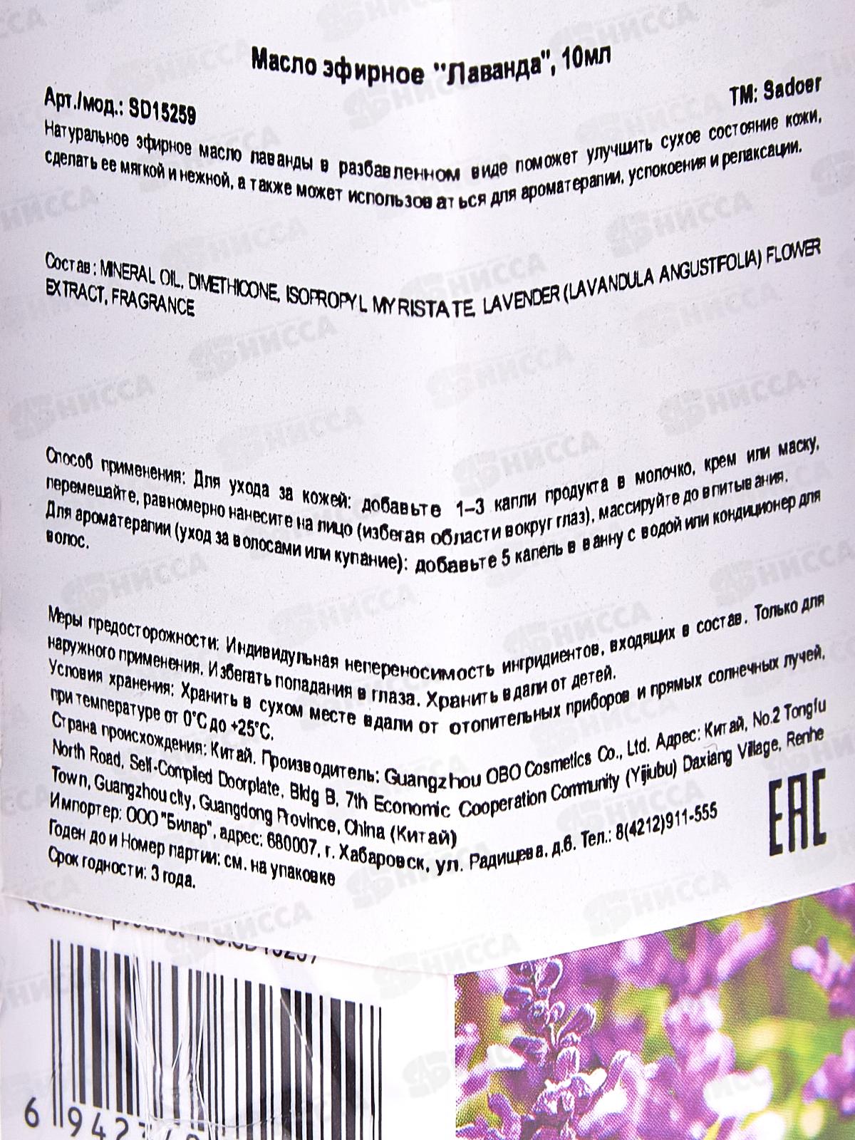 Sadoer аромамасло смягч для лица тела волос 10мл Лаванда