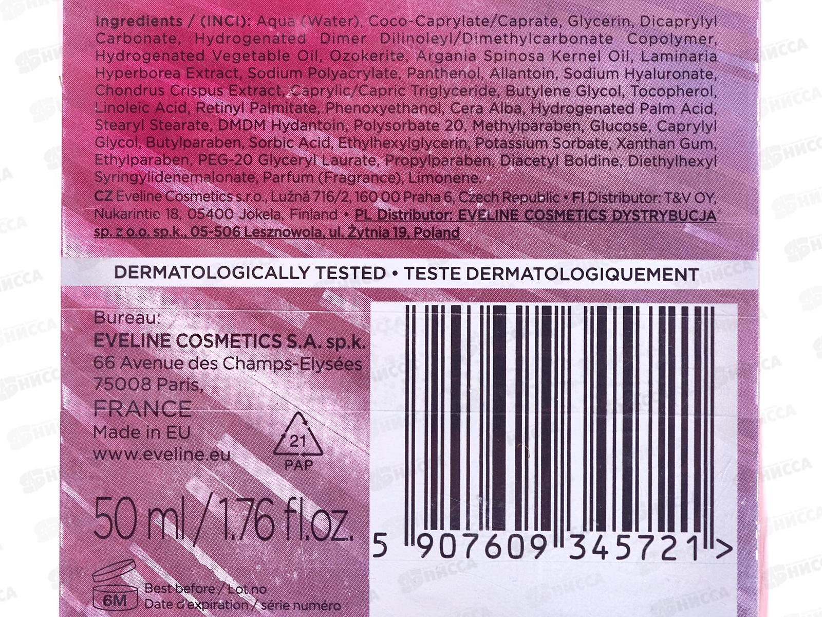 Регулирует синтез меланина, освежая и придавая деликатное сияние. Состав: Аква (Вода), Кокос-каприлат/Капрат, Глицерин, Дикаприлкарбонат, Гидрогенизированный сополимер Димера Дилинолейла/диметилкарбоната, Гидрогенизированное растительное масло, Озокерит, Масло косточек аргании Спинозы, Экстракт ламинарии гиперборей, полиакрилат натрия, Пантенол, Аллантоин, гиалуронат натрия, Экстракт хондруса хрустящего, Каприловый триглицерид, Бутиленгликоль, Токоферол, Линолевая кислота, Ретинилпальмитат, феноксиэтанол, Цера Альба, гидрогенизированная пальмовая кислота, Стеарилстеарат, Гидантоин DMDM, Полисорбат 20, Метилпарабен, Глюкоза, Каприлгликоль, Бутилпарабен, Сорбиновая кислота, Этилгексилглицерин, Сорбат калия, Ксантановая камедь, Этилпарабен, ПЭГ-20 Глицериллаурат, Пропилпарабен, Диацетилболдин, Диэтилгексил Сирингилиденмалонат, Парфюмированная вода (отдушка), Лимонен.
